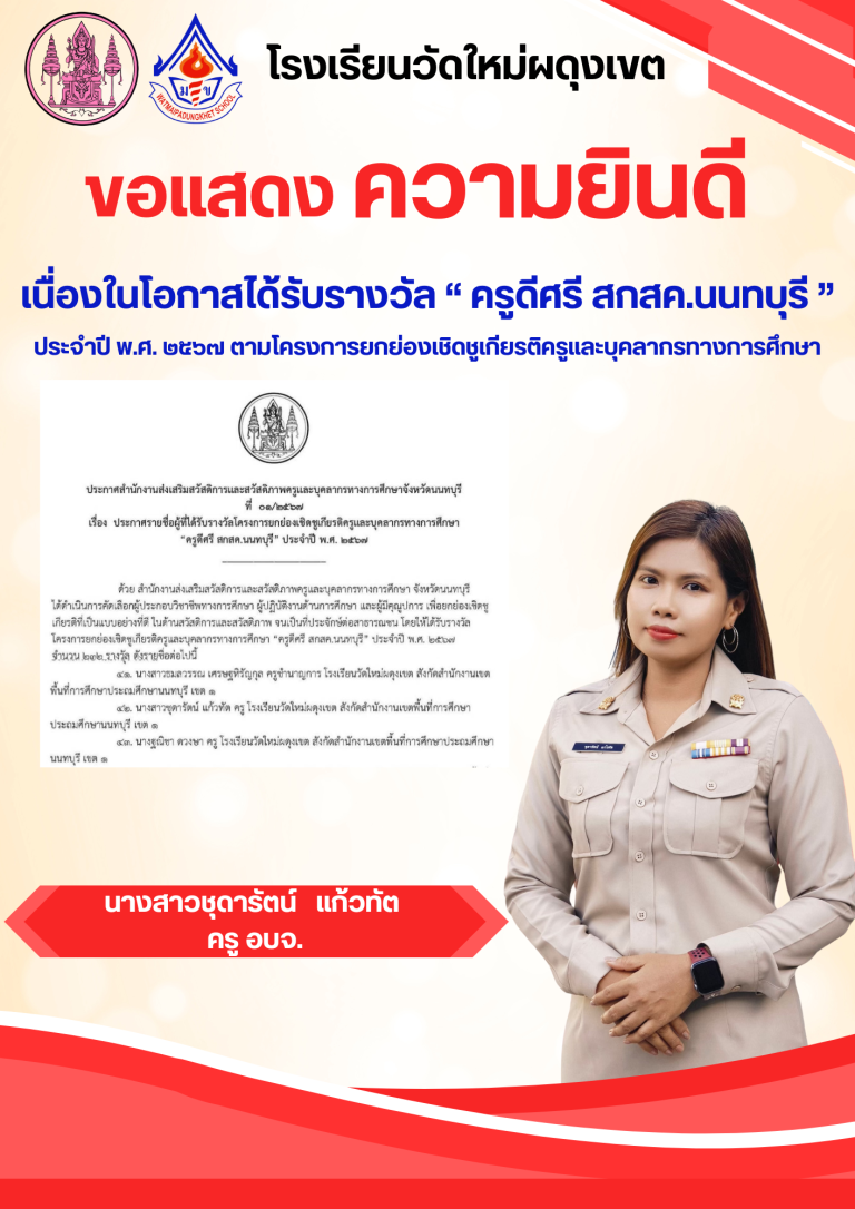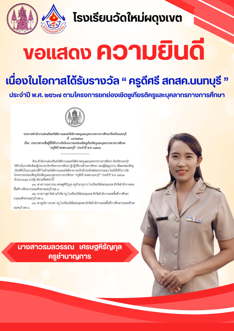กลุ่มโรงเรียนอำเภอบางกรวยโรงเรียนวัดเชิงกระบือ ขอแสดงความยินดี กับนางสาวนฤมล กาฬภักดี ตำแหน่งครูวิทยฐานะชำนาญการพิเศษ ได้รับการยกย่องเชิดชูเกียรติ”คุรุชนคนคุณธรรม”ประเภทครู” ระดับเขตตรวจราชการที่ 1 ตามโครงการโรงเรียนคุณธรรม สพฐ.ประจำปี พ.ศ. 256620 กันยายน 202414 ธันวาคม 2024วัดเชิงกระบือ โรงเรียนอ่านต่อ
