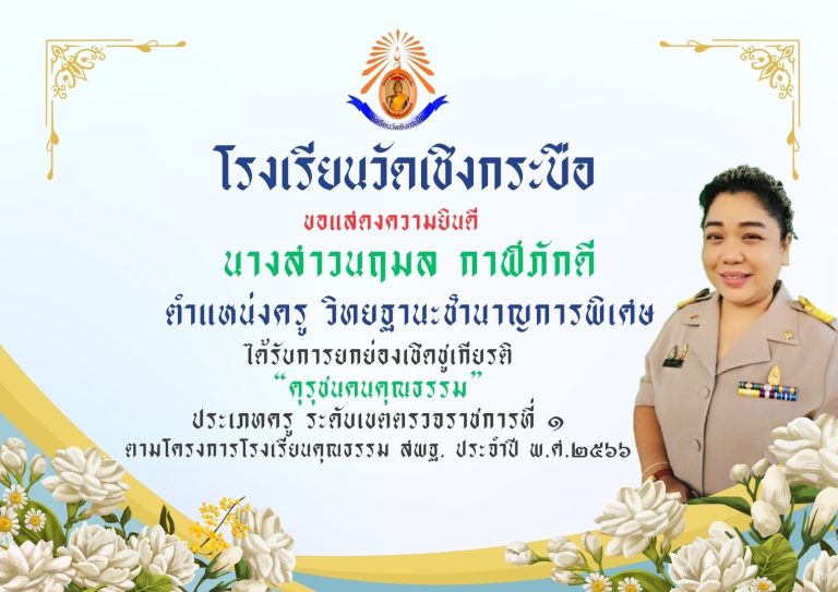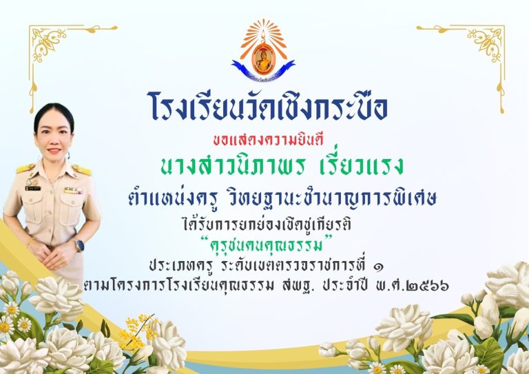 กลุ่มโรงเรียนอำเภอบางกรวยโรงเรียนวัดเชิงกระบือ ขอแสดงความยินดี กับ นางสาวนิภาพร เรี่ยวแรง ตำแหน่งครูวิทยฐานะชำนาญการพิเศษ ได้รับการยกย่องเชิดชูเกียรติ”คุรุชนคนคุณธรรม” ประเภทครู ระดับเขตตรวจราชการที่ 1 ตามโครงการโรงเรียนคุณธรรม สพฐ.ประจำปี พ.ศ.256620 กันยายน 202414 ธันวาคม 2024วัดเชิงกระบือ โรงเรียนอ่านต่อ