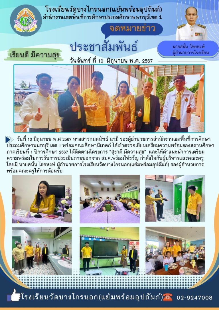 กลุ่มโรงเรียนอำเภอบางกรวยตรวจเยี่ยมการเตรียมความพร้อมของสถานศึกษาภาคเรียนที่ 1 ปีการศึกษา 2567 โครงการ “สุขาดี มีความสุข”11 มิถุนายน 2024โรงเรียน วัดบางไกรนอก(แย้มพร้อมอุปถัมภ์)อ่านต่อ