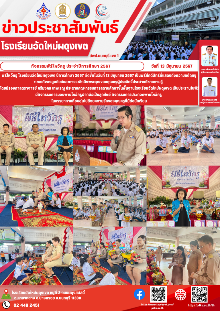 กลุ่มโรงเรียนอำเภอบางกรวยกิจกรรมพิธีไหว้ครู ประจำปีการศึกษา 256713 มิถุนายน 202425 ตุลาคม 2024โรงเรียน วัดใหม่ผดุงเขตอ่านต่อ