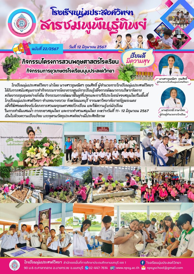 กลุ่มโรงเรียนอำเภอบางกรวยกิจกรรมชงชาสมุนไพร การทำพิเสนน้ำ และการทำสวนสมุนไพรบูรณาสู่กิจกรรมโครงการสวนพฤษศาสตร์โรงเรียนและกิจกรรมยุวเกษตรกร12 มิถุนายน 20244 สิงหาคม 2024โรงเรียน นุ่มประสงค์อ่านต่อ