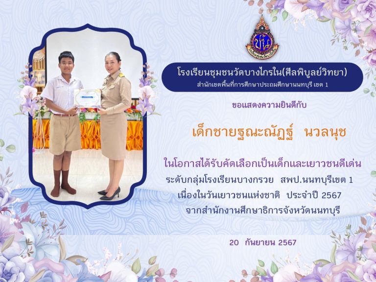 กลุ่มโรงเรียนอำเภอบางกรวยรางวัลชมเชยระดับประเทศ บุคคลต้นแบบด้านการอนุรักษ์พลังงานและสิ่งแวดล้อม ผู้ขับเคลื่อนกิจกรรมโรงเรียนเบอร์ ๕ ประจำปี ๒๕๖๗ โดยการไฟฟ้าฝ่ายผลิตแห่งประเทศไทย26 กันยายน 202426 กันยายน 2024ชุมชนวัดบางไกรใน(ศีลพิบูลย์วิทยา) โรงเรียนอ่านต่อ