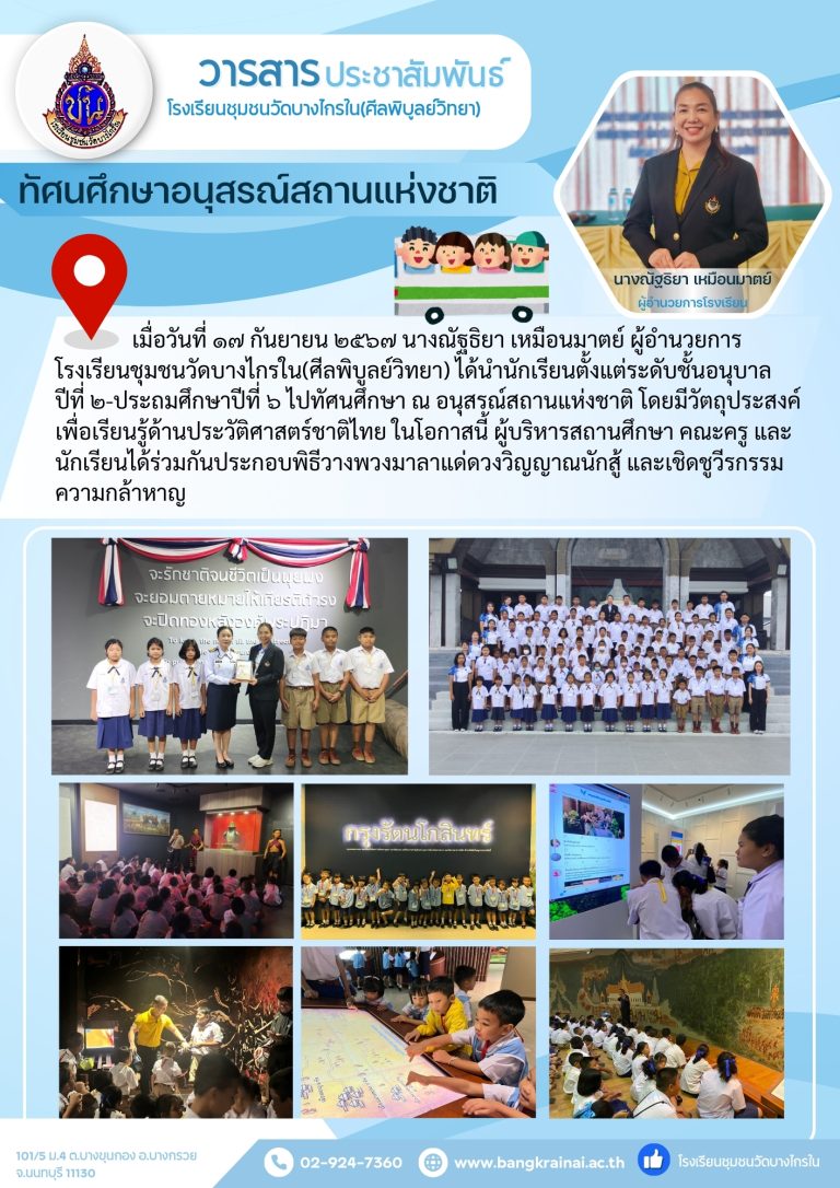 กลุ่มโรงเรียนอำเภอบางกรวยโรงเรียนชุมชนวัดบางไกรใน(ศีลพิบูลย์วิทยา) ได้นำนักเรียนไปทัศนศึกษา ณ อนุสรณ์สถานแห่งชาติ26 กันยายน 2024ชุมชนวัดบางไกรใน(ศีลพิบูลย์วิทยา) โรงเรียนอ่านต่อ