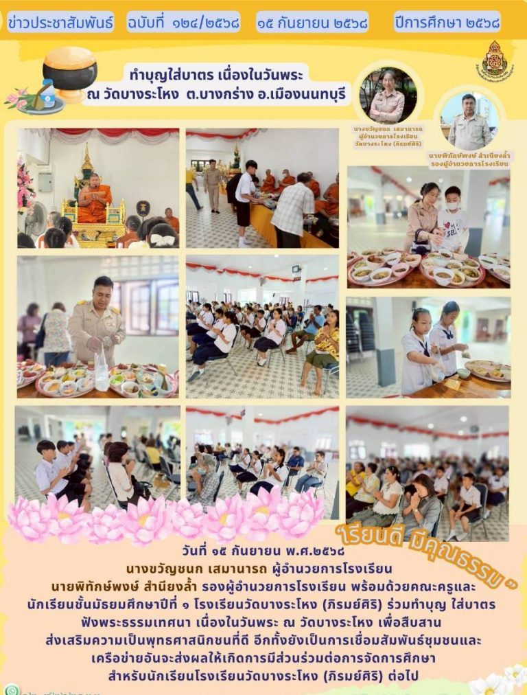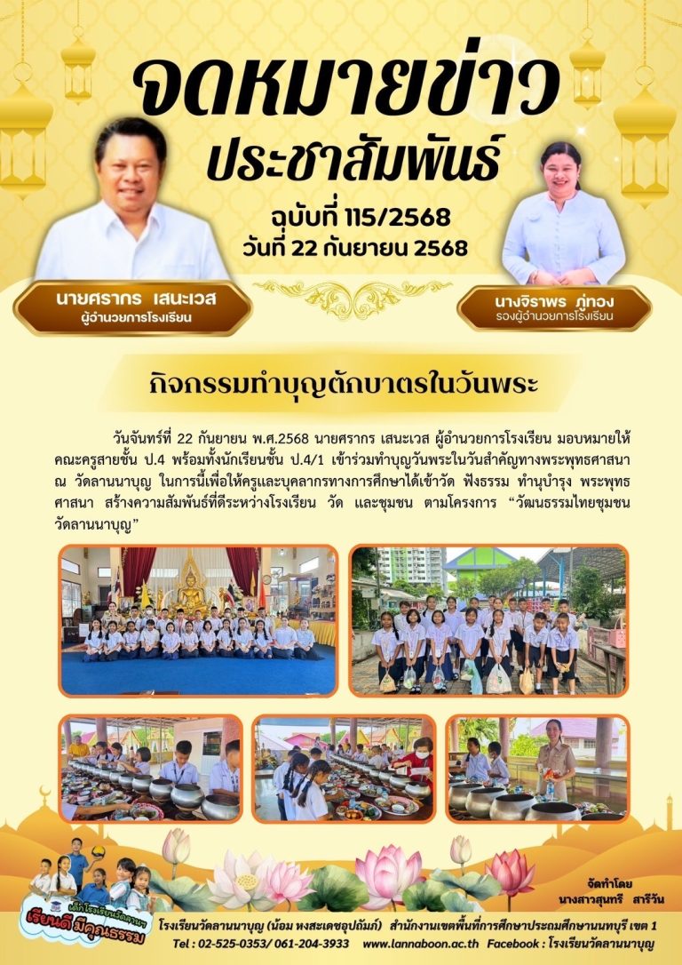 กลุ่มโรงเรียนเมืองนนท์ 1“กิจกรรมทำบุตักบาตรในวันพระ”22 กันยายน 202527 กันยายน 2025วัดลานนาบุญ (น้อม หงสะเดชอุปถัมภ์) โรงเรียนอ่านต่อ