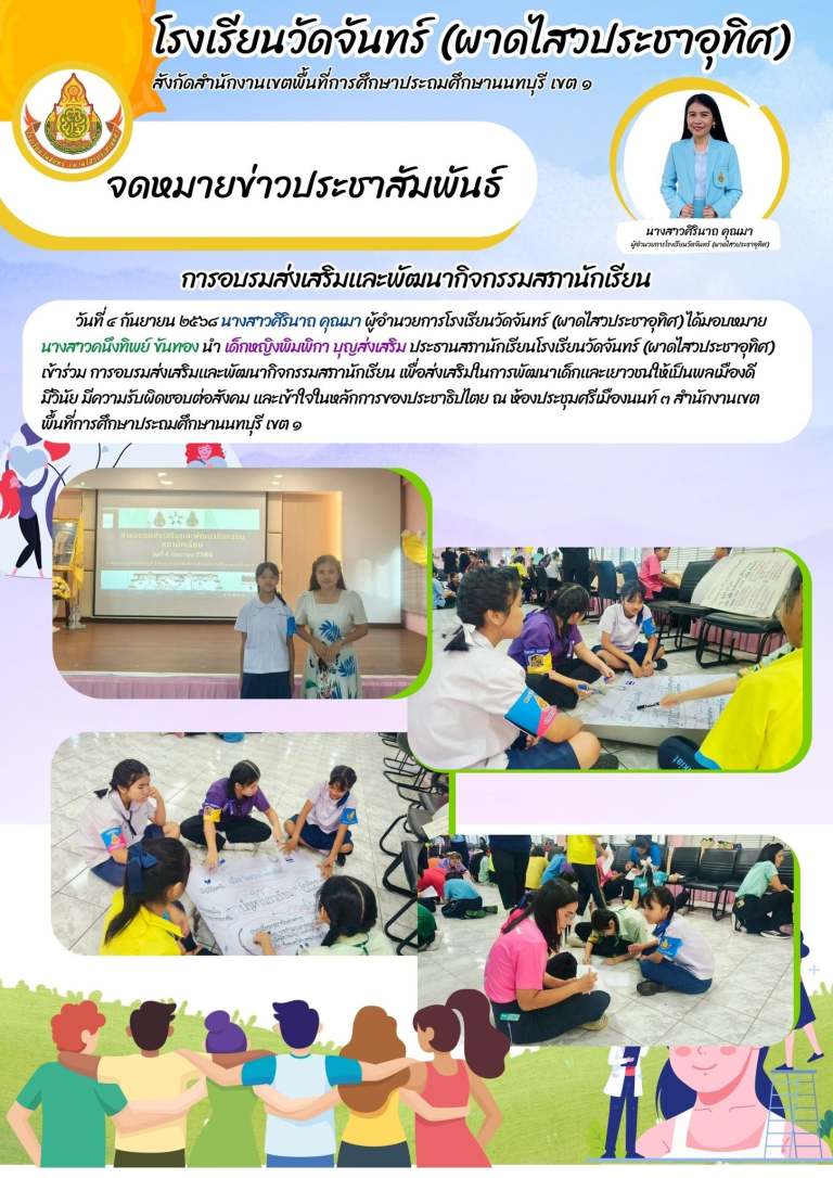 กลุ่มโรงเรียนอำเภอบางกรวยการอบรมส่งเสริมเเละพัฒนากิจกรรมสภานักเรียน เพื่อส่งเสริมในการพัฒนาเด็กเเละเยาวชนให้เป็นพลเมืองดี มีวินัย มีความรับผิดชอบต่อสังคม เเละเข้าใจในหลักการของประชาธิปไตย6 ตุลาคม 20256 ตุลาคม 2025วัดจันทร์(ผาดไสวประชาอุทิศ) โรงเรียนอ่านต่อ