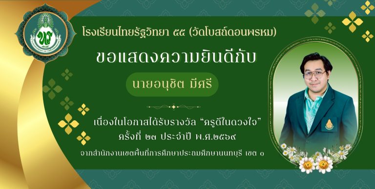 กลุ่มโรงเรียนเมืองนนท์ 2ขอแสดงความยินดีกับ นายอนุชิต มีศรี เนื่องในโอกาสได้รับรางวัล “ครูดีในดวงใจ”3 พฤศจิกายน 20253 พฤศจิกายน 2025ไทยรัฐวิทยา ๕๕ (วัดโบสถ์ดอนพรหม) โรงเรียนอ่านต่อ