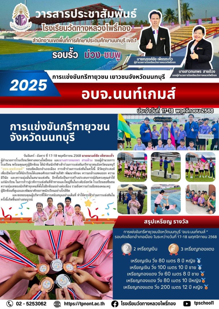 กลุ่มโรงเรียนเมืองนนท์ 1“การแข่งกรีฑายุวชน เยาวชน จังหวัดนนทบุรี อบจ.นนท์เกมส์”18 พฤศจิกายน 202528 พฤศจิกายน 2025วัดลานนาบุญ (น้อม หงสะเดชอุปถัมภ์) โรงเรียนอ่านต่อ