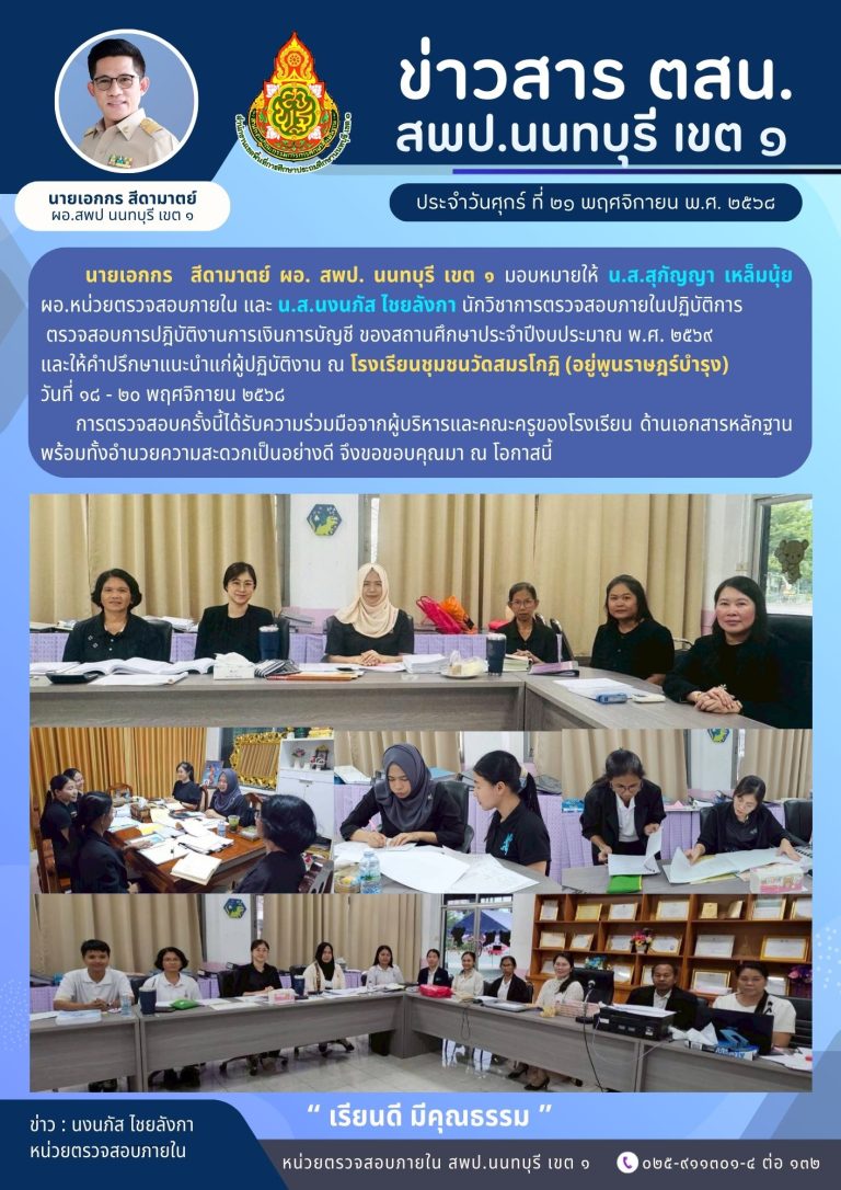 หน่วยตรวจสอบภายในหน่วยตรวจสอบภายใน ออกตรวจการเงินการบัญชี ณ โรงเรียนชุมชนวัดสมรโกฏิ (อยู่พูนราษฎร์บำรุง) วันที่ 18-20 พฤศจิกายน 256821 พฤศจิกายน 202521 พฤศจิกายน 2025นงนภัส ไชยลังกาอ่านต่อ
