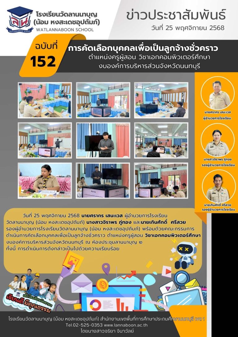 กลุ่มโรงเรียนเมืองนนท์ 1“การคัดเลือกบุคคลเพื่อเป็นลูกจ้างชั่วคราว ตำแหน่งครูผู้สอน วิชาคอมพิวเตอร์ศึกษา”25 พฤศจิกายน 202528 พฤศจิกายน 2025วัดลานนาบุญ (น้อม หงสะเดชอุปถัมภ์) โรงเรียนอ่านต่อ