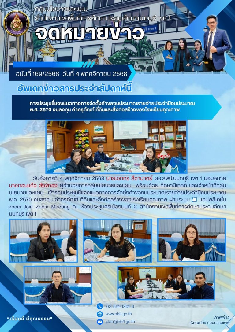 วันที่ 16 กุมภาพันธ์ 2566 ดร.ปารณทัตต์ แสนวิเศษ ผอ.สพป.นนทบุรี เขต 1 มอบหมาย นายยุทธนา พรทิพย์ รองผู้อำนวยการ สพป.นนทบุรี เขต 1 นางวราภรณ์ ยอนถวิล ผู้อำนวยการกลุ่มนโยบาย นางกอบแก้ว สังข์ทอง นักวิเคราะห์นโยบายและแผนชำนาญการพิเศษ ประชุมคณะอนุกรรมการพัฒนาการศึกษา จังหวัดนนทบุรี ณ ห้องประชุมจอมพล ป.พิบูลสงคราม อาคาร 1 ชั้น 2 โรงเรียนวัดเขมาภิรตาราม อำเภอเมืองนนทบุรี จังหวัดนนทบุรี