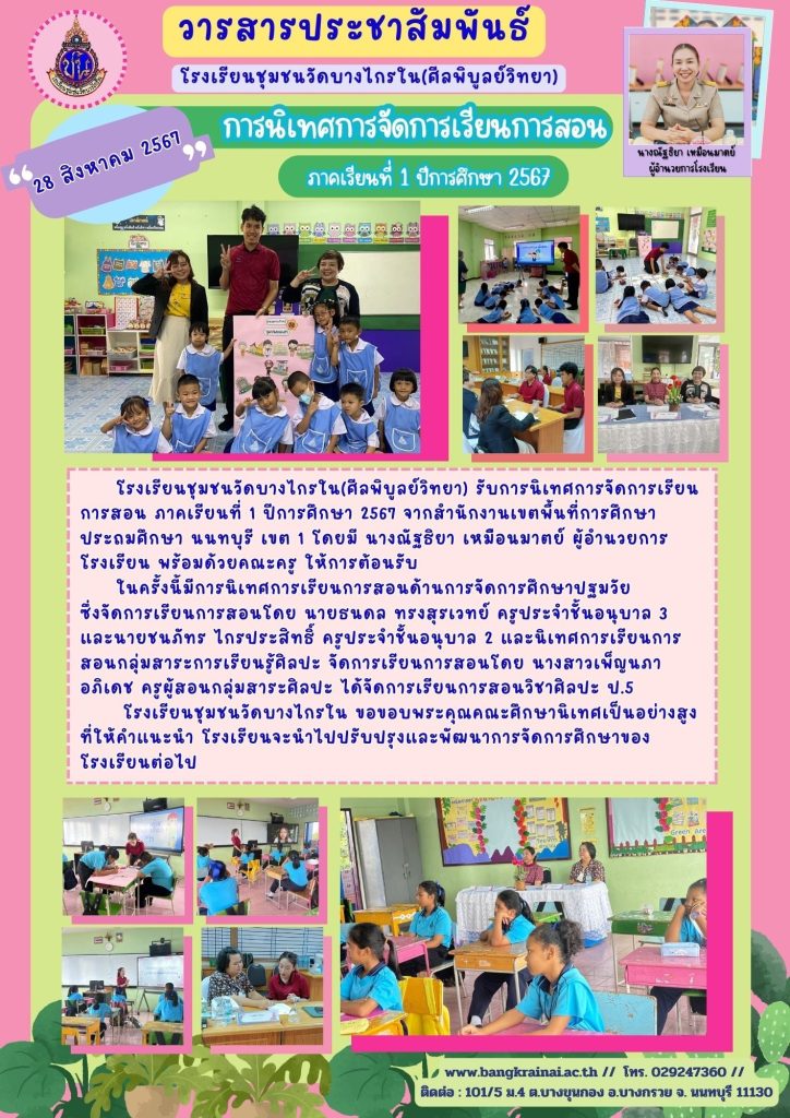 โรงเรียนชุมชนวัดบางไกรใน(ศีลพิบูลย์วิทยา) รับการนิเทศการจัดการเรียนการสอน ภาคเรียนที่ 1 ปีการศึกษา 2567 จากสำนักงานเขตพื้นที่การศึกษาประถมศึกษานนทบุรี เขต 1 โดยมีนางณัฐธิยา เหมือนมาตย์ ผู้อำนวยการโรงเรียน พร้อมคณะครู ให้การต้อนรับ
