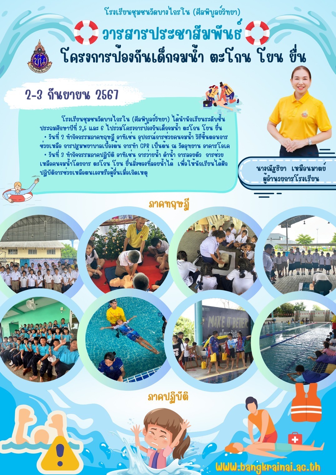 โรงเรียนชุมชนวัดบางไกรใน(ศีลพิบูลย์วิทยา) ได้นำนักเรียนชั้นประถมศึกษาปีที่ 3,5 และ 6 ร่วมโครงการป้องกันเด็กจมน้ำ ตะโกน โยน ยื่น ณ วัดอุทยาน