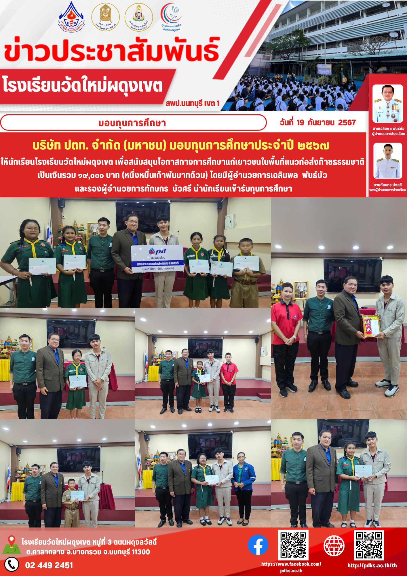 บริษัท ปตท. จำกัด (มหาชน) มอบทุนการศึกษาประจำปี ๒๕๖๗ ให้นักเรียนโรงเรียนวัดใหม่ผดุงเขต เพื่อสนับสนุนโอกาสทางการศึกษาแก่เยาวชนในพื้นที่แนวท่อส่งก๊าซธรรมชาติ เป็นเงินรวม ๑๙,๐๐๐ บาท (หนึ่งหมื่นเก้าพันบาทถ้วน) โดยมีผู้อำนวยการเฉลิมพล พันธ์บัว และรองผู้อำนวยการทักษกร บัวศรี นำนักเรียนเข้ารับทุนการศึกษา