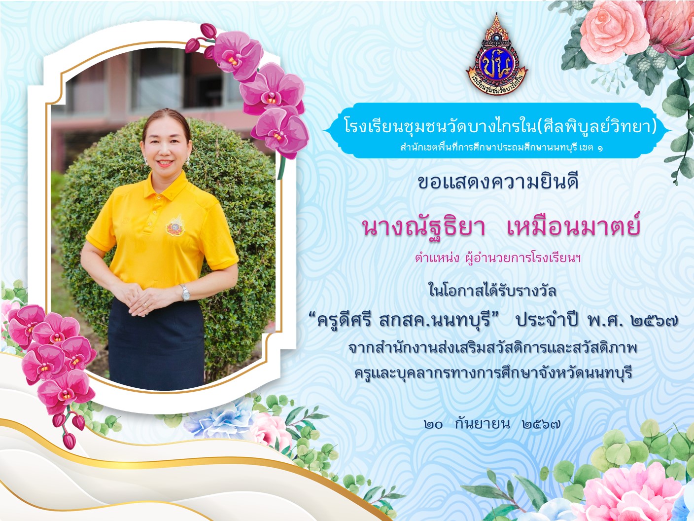 นางณัฐธิยา เหมือนมาตย์ ผู้อำนวยการโรงเรียนชุมชนวัดบางไกรใน(ศีลพิบูลย์วิทยา) ได้รับรางวัล “ครูดีศรี สกสค.นนทบุรี ” ประจำปี พ.ศ.2567″