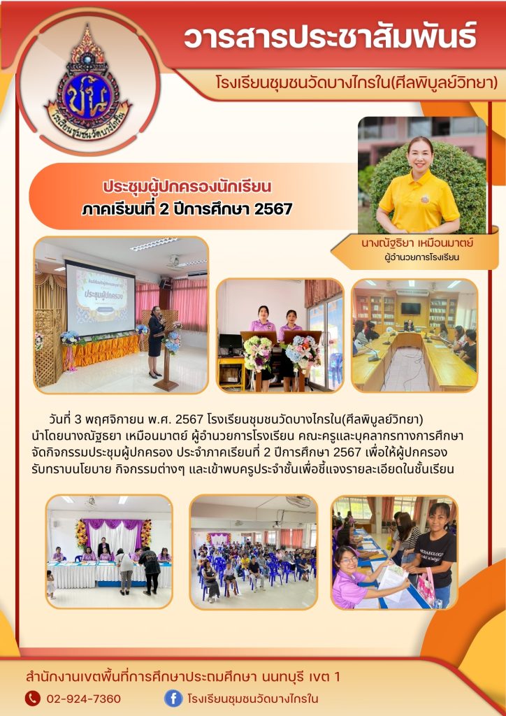 วันที่ 3 พฤศจิกายน 2567 โรงเรียนชุมชนวัดบางไกรใน(ศีลพิบูลย์วิทยา) นำโดยนางณัฐธิยา เหมือนมาตย์ ผู้อำนวยการโรงเรียน คณะครูและบุคลากรทางการศึกษา จัดกิจกรรมประชุมผู้ปกครอง ประจำภาคเรียนที่ 2 ปีการศึกษา 2567 เพื่อให้ผู้ปกครองรับทราบถึงนโยบาย กิจกรรมต่างๆของโรงเรียน และเข้าพบครูประจำชั้นเพื่อชี้แจงรายละเอียดต่างๆในชั้นเรียน