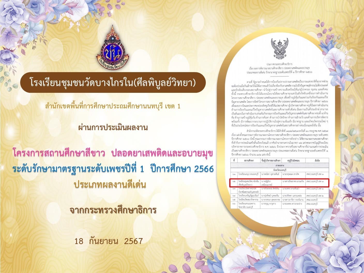 โรงเรียนชุมชนวัดบางไกรใน(ศีลพิบูลย์วิทยา) ผ่านการประเมินโครงการสถานศึกษาสีขาวปลอดยาเสพติดและอบายมุข ปีการศึกษา 2566 ระดับรักษามาตรฐานระดับเพชรปีที่ 1 ประเภทผลงานดีเด่น จากกระทรวงศึกษาธิการ