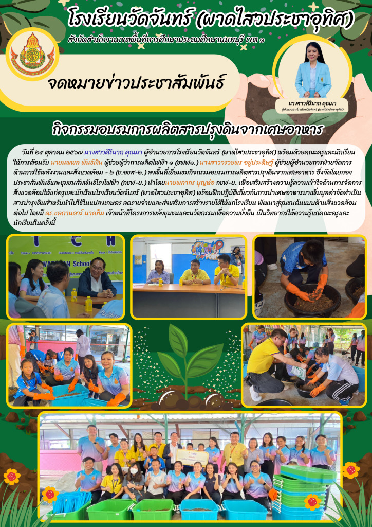 วันที่ ๒๔ ตุลาคม ๒๕๖๗ นางสาวศิรินาถ คุณมา ผู้อำนวยการโรงเรียนวัดจันทร์ (ผาดไสวประชาอุทิศ) พร้อมด้วยคณะครูและนักเรียน ให้การต้อนรับ นายนพพล พันธ์เงิน ผู้ช่วยผู้ว่าการผลิตไฟฟ้า ๑ (ชฟฟ๑.) นางสาวจรวยพร อยู่ประดิษฐ์ ผู้ช่วยผู้อำนวยการฝ่ายจัดการด้านการใช้พลังงานและสิ่งแวดล้อม - ๒ (ช.อชส-๒.) ลงพื้นที่เยี่ยมชมกิจกรรมอบรมการผลิตสารปรุงดินจากเศษอาหาร ซึ่งจัดโดยกองประชาสัมพันธ์และชุมชนสัมพันธ์โรงไฟฟ้า (กชฟ-ย.) นำโดยนายพลากร บุญห่อ กชฟ-ย. เพื่อเสริมสร้างความรู้ความเข้าใจด้านการจัดการสิ่งแวดล้อมให้แก่ครูและนักเรียนโรงเรียนวัดจันทร์ (ผาดไสวประชาอุทิศ) พร้อมฝึกปฏิบัติเกี่ยวกับการนำเศษอาหารมาเพิ่มมูลค่าจัดทำเป็นสารบำรุงดินสำหรับนำไปใช้ในแปลงเกษตร ลดรายจ่ายและส่งเสริมการสร้างรายได้ให้แก่โรงเรียน พัฒนาสู่ชุมชนต้นแบบด้านสิ่งแวดล้อมต่อไป โดยมี ดร.ชลกานดาร์ นาคทิม เจ้าหน้าที่โครงการพลังชุมชนและนวัตกรรมเพื่อความยั่งยืน เป็นวิทยากรให้ความรู้แก่คณะครูและนักเรียนในครั้งนี้
