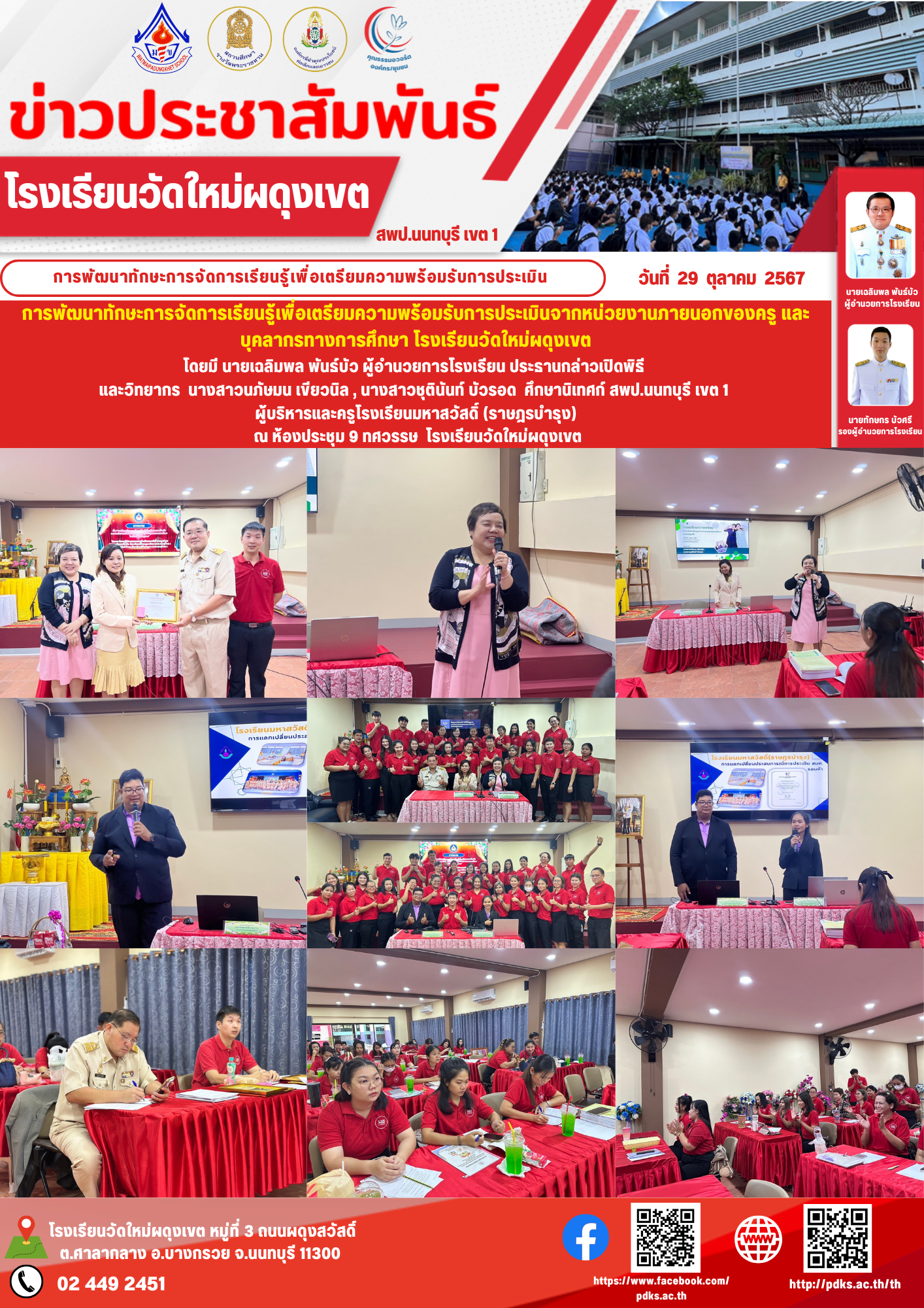 การพัฒนาทักษะการจัดการเรียนรู้เพื่อเตรียมความพร้อมรับการประเมินจากหน่วยงานภายนอกของครู และบุคลากรทางการศึกษา โรงเรียนวัดใหม่ผดุงเขต โดยมี นายเฉลิมพล พันธ์บัว ผู้อำนวยการโรงเรียน ประธานกล่าวเปิดพิธี และวิทยากร นางสาวนภัษมน เขียวนิล , นางสาวชุตินันท์ บัวรอด ศึกษานิเทศก์ สพป.นนทบุรี เขต 1 ผู้บริหารและครูโรงเรียนมหาสวัสดิ์ (ราษฎรบำรุง)