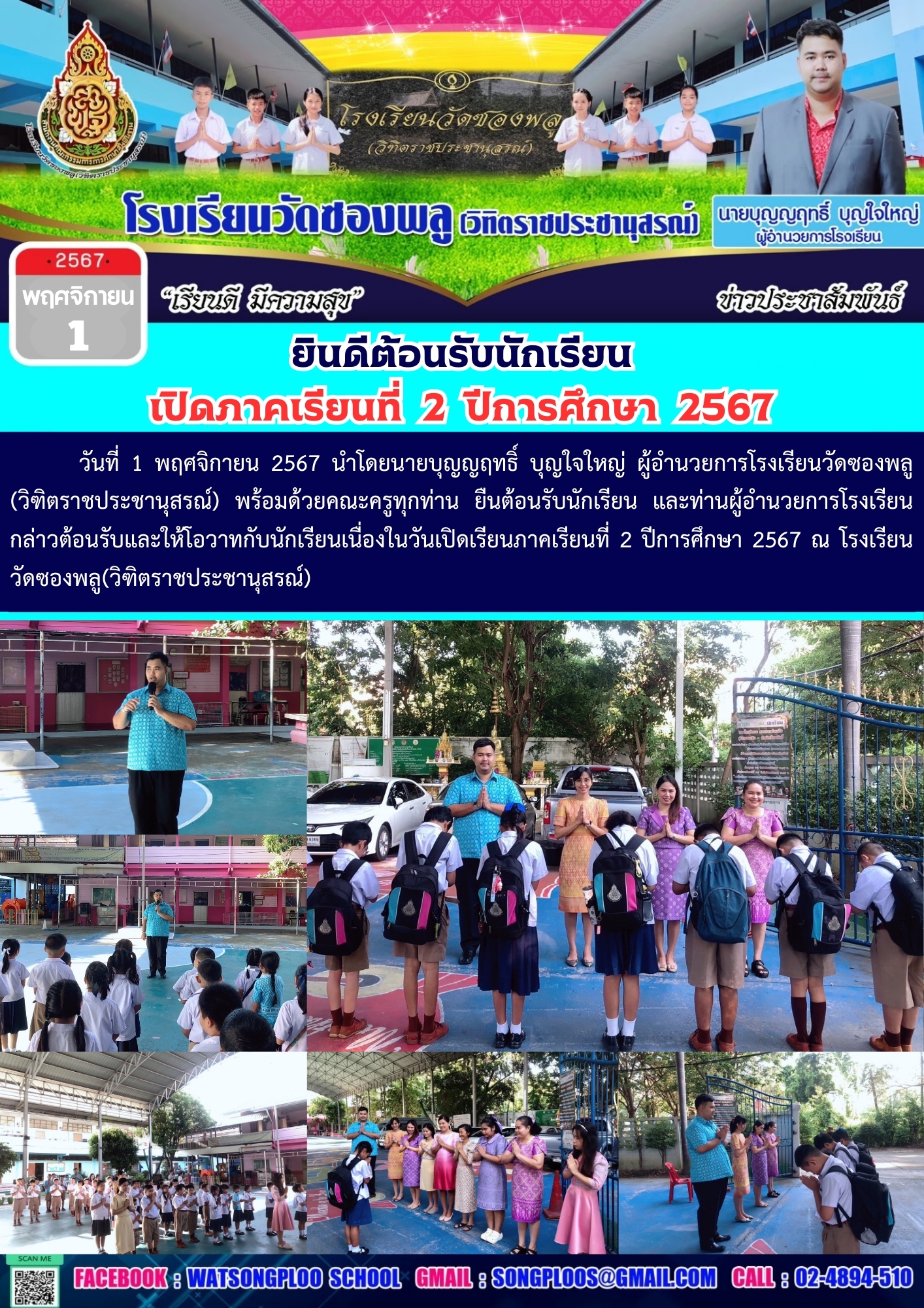 วันที่ 1 พฤศจิกายน 2567 นำโดยนายบุญญฤทธิ์ บุญใจใหญ่ ผู้อำนวยการโรงเรียนวัดซองพลู (วิฑิตราชประชานุสรณ์) พร้อมด้วยคณะครูทุกท่าน ยืนต้อนรับนักเรียน และท่านผู้อำนวยการโรงเรียนกล่าวต้อนรับและให้โอวาทกับนักเรียนเนื่องในวันเปิดเรียนภาคเรียนที่ 2 ปีการศึกษา 2567 ณ โรงเรียน วัดซองพลู(วิฑิตราชประชานุสรณ์)