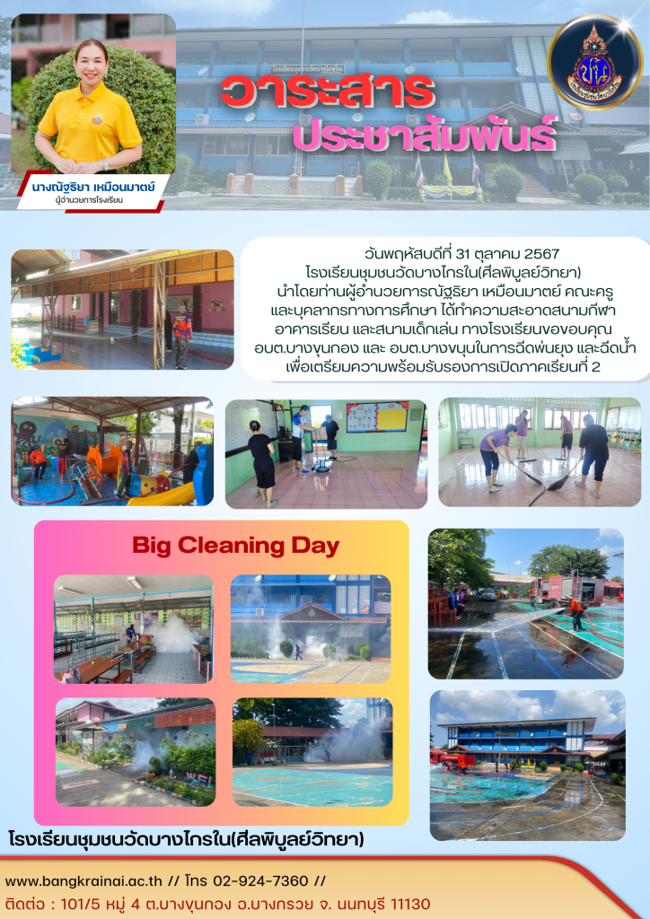 วันที่ 31 ตุลาคม 2567 โรงเรียนชุมชนวัดบางไกรใน(ศีลพิบูลย์วิทยา) นำโดยท่านผู้อำนวยการณัฐธิยา เหมือนมาตย์ คณะครูและบุคลากรทางการศึกษา ได้ทำความสะอาดสนามกีฬา อาคารเรียน และสนามเด็กเล่น ทางโรงเรียนขอขอบคุณ อบต.บางขุนกอง และ อบต.บางขนุน ในการมาช่วยเหลือฉีดพ่นยุง และ ฉีดน้ำ เพื่อเตรียมความพร้อมรับรองการเปิดภาคเรียนที่ 2