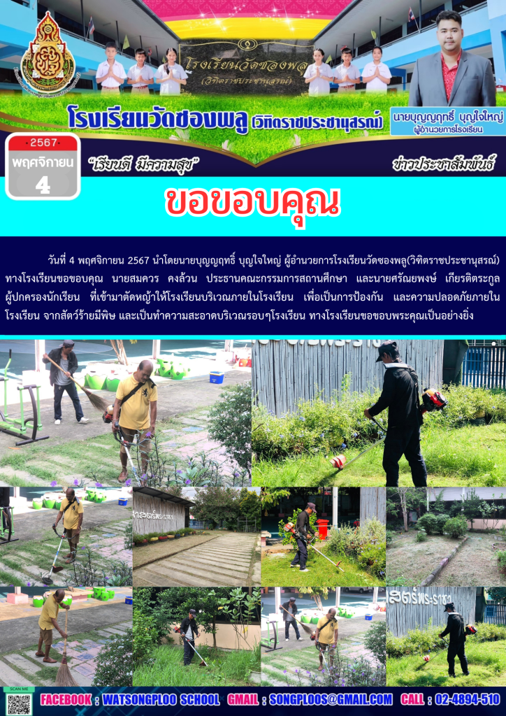 วันที่ 4 พฤศจิกายน 2567 นำโดยนายบุญญฤทธิ์ บุญใจใหญ่ ผู้อำนวยการโรงเรียนวัดซองพลู(วิฑิตราชประชานุสรณ์)ทางโรงเรียนขอขอบคุณ นายสมควร คงล้วน ประธานคณะกรรมการสถานศึกษา และนายศรัณยพงษ์ เกียรติตระกูล ผู้ปกครองนักเรียน ที่เข้ามาตัดหญ้าให้โรงเรียนบริเวณภายในโรงเรียน เพื่อเป็นการป้องกัน และความปลอดภัยภายในโรงเรียน จากสัตว์ร้ายมีพิษ และเป็นทำความสะอาดบริเวณรอบๆโรงเรียน ทางโรงเรียนขอขอบพระคุณเป็นอย่างยิ่ง