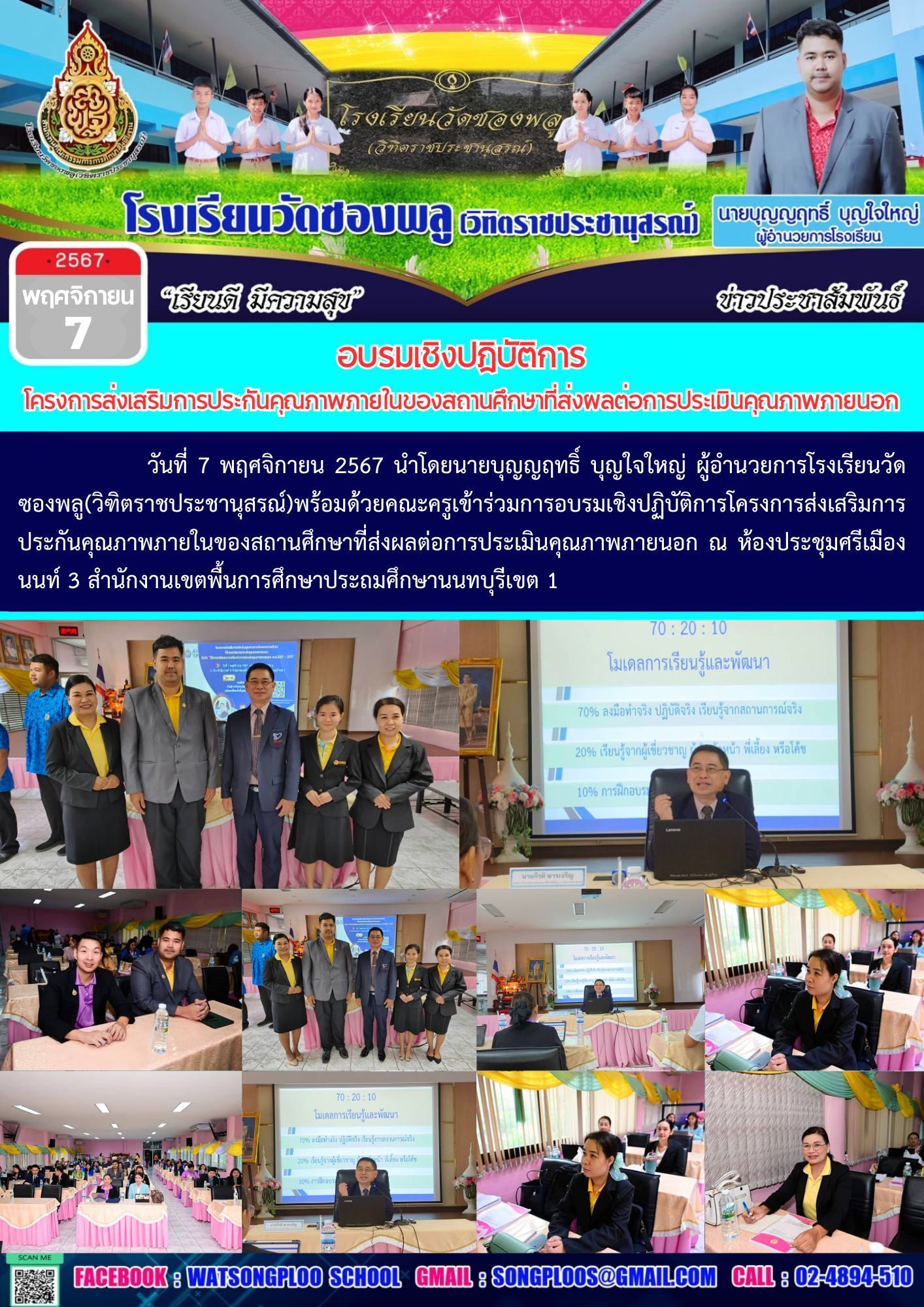 วันที่ 7 พฤศจิกายน 2567 นำโดยนายบุญญฤทธิ์ บุญใจใหญ่ ผู้อำนวยการโรงเรียนวัดซองพลู(วิฑิตราชประชานุสรณ์)พร้อมด้วยคณะครูเข้าร่วมการอบรมเชิงปฏิบัติการโครงการส่งเสริมการประกันคุณภาพภายในของสถานศึกษาที่ส่งผลต่อการประเมินคุณภาพภายนอก ณ ห้องประชุมศรีเมืองนนท์ 3 สำนักงานเขตพื้นการศึกษาประถมศึกษานนทบุรีเขต 1