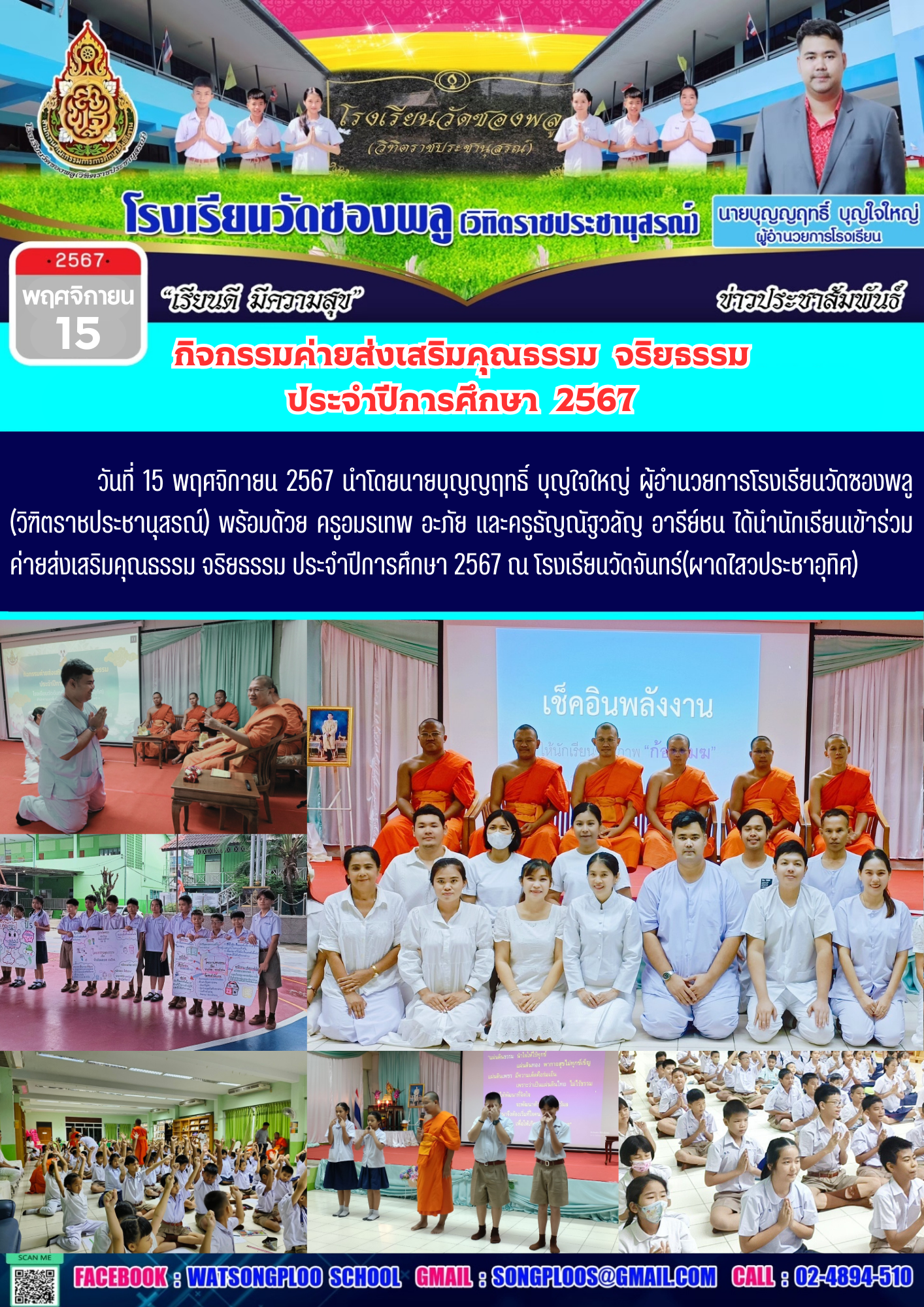 วันที่ 15 พฤศจิกายน 2567 นำโดยนายบุญญฤทธิ์ บุญใจใหญ่ ผู้อำนวยการโรงเรียนวัดซองพลู (วิฑิตราชประชานุสรณ์) พร้อมด้วย ครูอมรเทพ อะภัย และครูธัญณัฐวลัญ อารีย์ชน ได้นำนักเรียนเข้าร่วมค่ายส่งเสริมคุณธรรม จริยธรรม ประจำปีการศึกษา 2567 ณ โรงเรียนวัดจันทร์(ผาดไสวประชาอุทิศ)