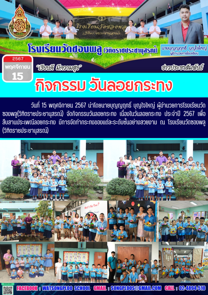 วันที่ 15 พฤศจิกายน 2567 นำโดยนายบุญญฤทธิ์ บุญใจใหญ่ ผู้อำนวยการโรงเรียนวัดซองพลู(วิฑิตราชประชานุสรณ์) จัดกิจกรรมวันลอยกระทง เนื่องในวันลอยกระทง ประจำปี 2567 เพื่อสืบสานประเพณีลอยกระทง มีการจัดทำกระทงของแต่ละระดับชั้นอย่างสวยงาม ณ โรงเรียนวัดซองพลู (วิฑิตราชประชานุสรณ์)