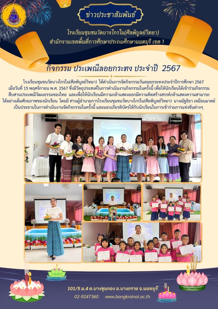 โรงเรียนชุมชนวัดบางไกรใน(ศีลพิบูลย์วิทยา) ได้ดำเนินการจัดกิจกรรมวันลอยกระทง ประจำปีการศึกษา ๒๕๖๗ จัดขึ้นในวันที่ ๑๕ พฤศจิกายน ๒๕๖๗ มีวัตถุประสงค์เพื่อให้นักเรียนมีความกล้าแสดงออก มีความคิดสร้างสรรค์และแสดงความสามารถได้อย่างเต็มศักยภาพของนักเรียน โดยมีท่านณัฐธิยา เหมือนมาตย์ ผู้อำนวยการโรงเรียนเป็นประธานในกิจกรรมครั้งนี้ และมอบเกียรติบัตร ให้กับนักเรียนในการเข้าร่วมการแข่งขันต่างๆ