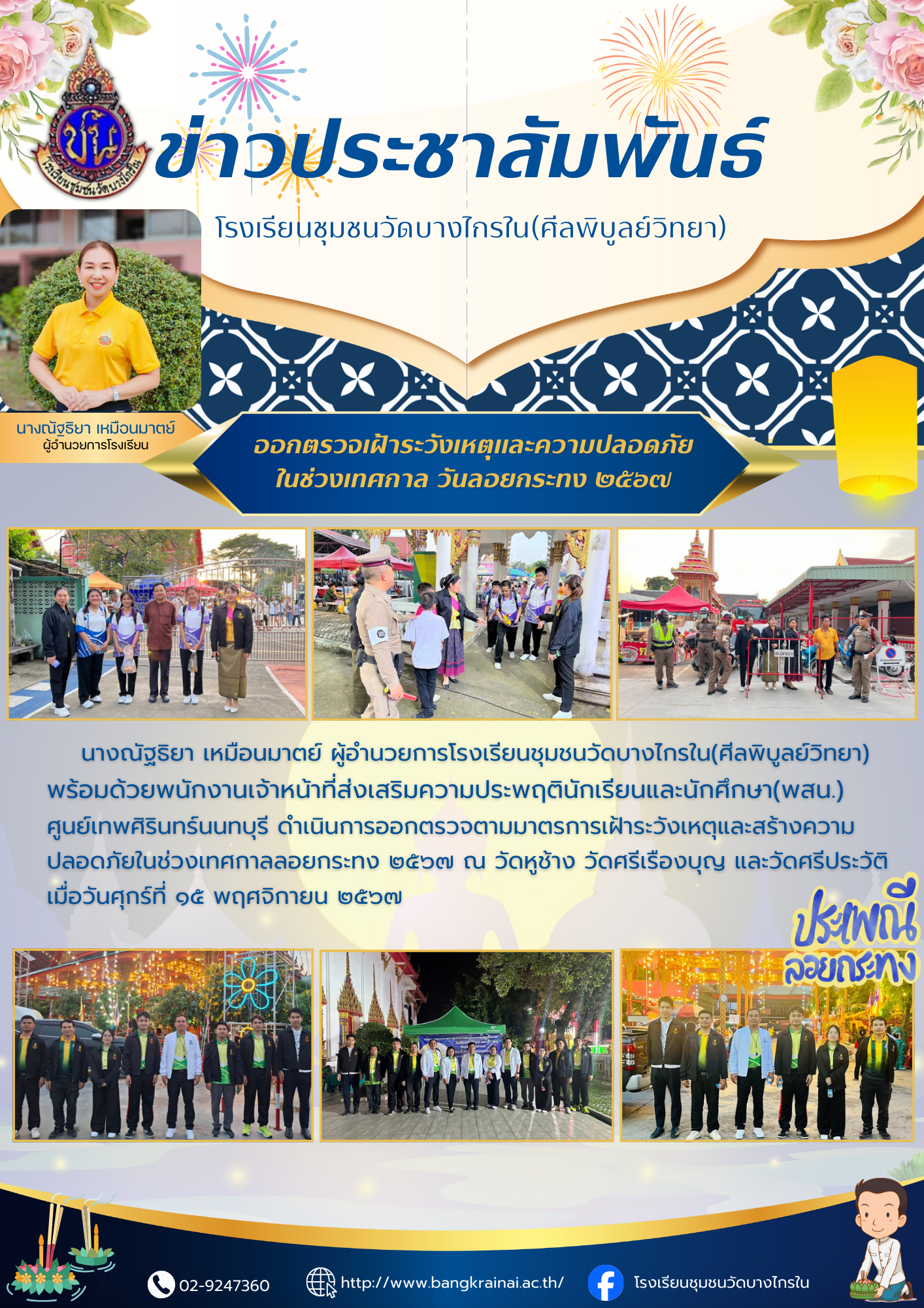 นางณัฐธิยา เหมือนมาตย์ ผู้อำนวยการโรงเรียนชุมชนวัดบางไกรใน(ศีลพิบูลย์วิทยา)พร้อมด้วยพนักงานเจ้าหน้าที่ส่งเสริมความประพฤตินักเรียนและนักศึกษา(พสน.)ศูนย์เทพศิรินทร์นนทบุรี ดำเนินการออกตรวจตามมาตรการเฝ้าระวังเหตุและสร้างความปลอดภัยในช่วงเทศกาลลอยกระทง ๒๕๖๗ ณ วัดหูช้าง วัดศรีเรืองบุญ และวัดศรีประวัติ เมื่อวันศุกร์ที่ ๑๕ พฤศจิกายน ๒๕๖๗