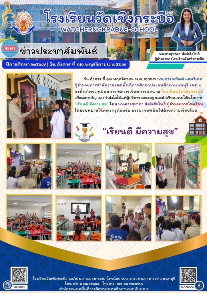 นายปารทัตต์ แสนวิเศษ ผู้อำนวยการสำนักงานเขตพื้นที่การศึกษาประถมศึกษานนทบุรี เขต 1 ลงพื้นที่ตรวจเยี่ยมการจัดการเรียนการสอน ณ โรงเรียนวัดเชิงกระบือ เพื่อมอบขวัญและกำลังใจให้แก่ผู้บริหาร คณะครู และนักเรียน ภายใต้นโยบาย “เรียนดี มีความสุข”
