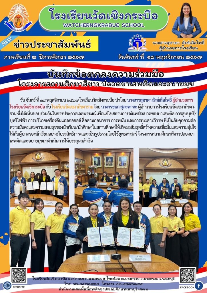 โรงเรียนวัดเชิงกระบือ นำโดยนางสาวสุชาดา สังข์เสือโพธิ์ ผู้อำนวยการโรงเรียนวัดเชิงกระบือ กับ โรงเรียนวัดเขมาภิรตาราม โดย นางกรชนก สุตะพาหะ ผู้อำนวยการโรงเรียนวัดเขมาภิรตารามซึ่งได้เห็นชอบร่วมกันในการประกาศเจตนารมณ์เพื่อแก้ไขสถานการณ์แพร่ระบาดของยาเสพติดที่เป็นภัยคุกคามต่อความมั่นคงและความสงบสุขของนักเรียน อย่างมีประสิทธิภาพโดยใช้ยุทธศาสตร์ โครงการสถานศึกษาสีขาวปลอดยาเสพติดและอบายมุขมาดำเนินการให้บรรลุผลสำเร็จ