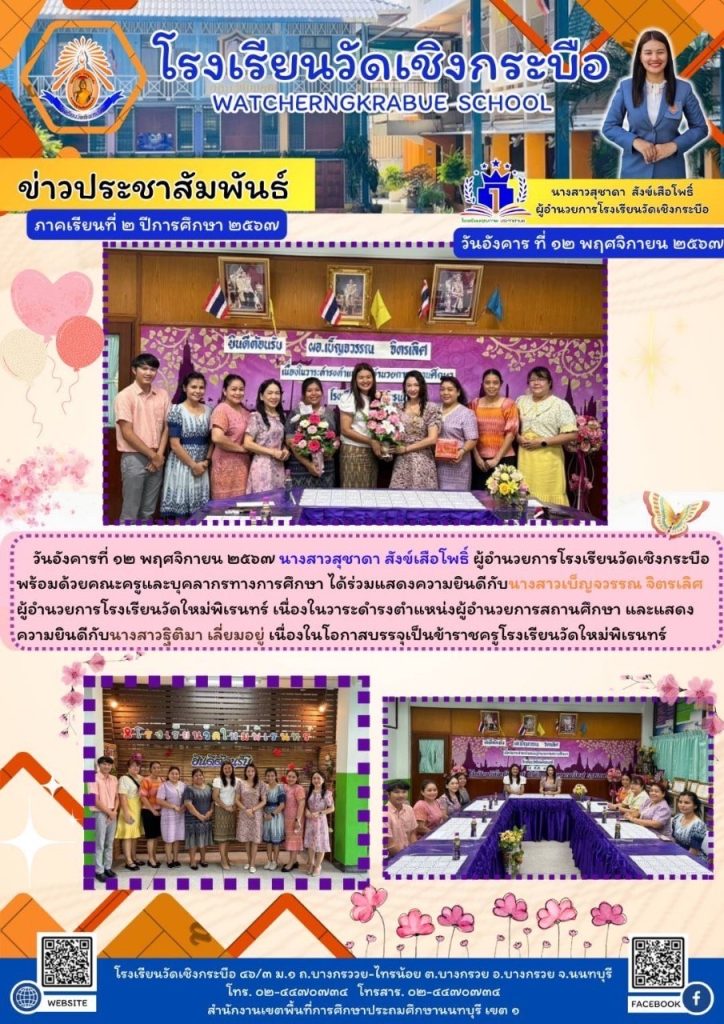 นางสาวสุชาดา สังข์เสือโพธิ์ ผู้อำนวยการโรงเรียนวัดเชิงกระบือพร้อมด้วยคณะครูและบุคลากรทางการศึกษา ได้ร่วมแสดงความยินดีกับ นางสาวเบ็ญจวรรณ จิตรเลิศผู้อำนวยการโรงเรียนวัดใหม่พิเรนทร์ เนื่องในวาระดำรงตำแหน่งผู้อำนวยการสถานศึกษาและแสดงความยินดีกับนางสาวฐิติมา เลี่ยมอยู่ เนื่องในโอกาสบรรจุเป็นข้าราชการครูโรงเรียนวัดใหม่พิเรนทร์