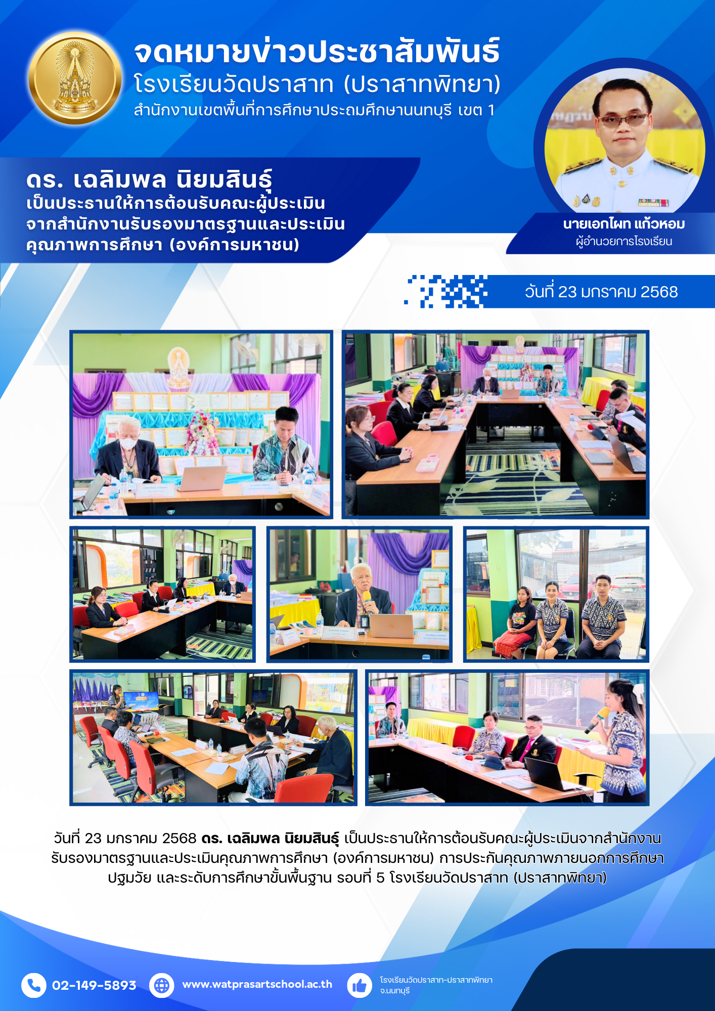 วันที่ 23 มกราคม 2568 ดร. เฉลิมพล นิยมสินธุ์ เป็นประธานให้การต้อนรับคณะผู้ประเมินจากสำนักงาน รับรองมาตรฐานและประเมินคุณภาพการศึกษา (องค์การมหาชน) การประกันคุณภาพภายนอกการศึกษาปฐมวัย และระดับการศึกษาขั้นพื้นฐาน รอบที่ 5 โรงเรียนวัดปราสาท (ปราสาทพิทยา)