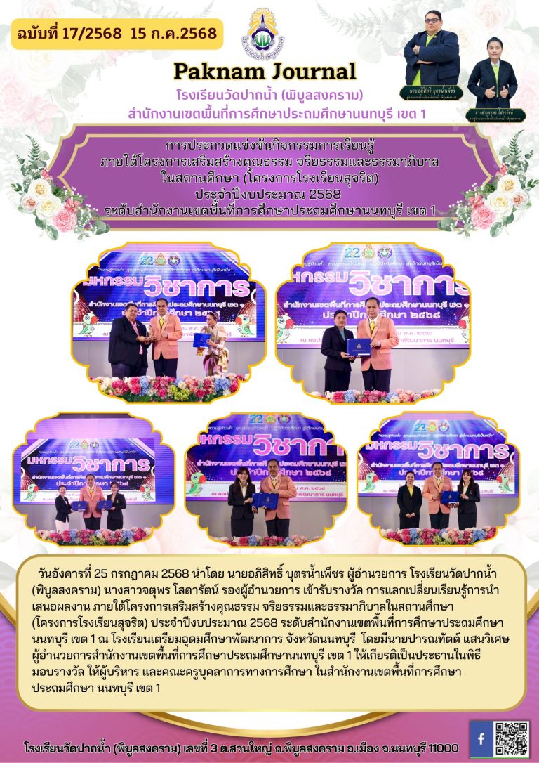 กลุ่มโรงเรียนเมืองนนท์ 1โรงเรียนวัดปากน้ำ (พิบูลสงคราม) เข้ารับรางวัล การแลกเปลี่ยนเรียนรู้การนำเสนอผลงาน ภายใต้โครงการเสริมสร้างคุณธรรม จริยธรรมและธรรมาภิบาลในสถานศึกษา (โครงการโรงเรียนสุจริต) ประจำปีงบประมาณ 256830 กันยายน 202530 กันยายน 2025โรงเรียน วัดปากน้ำ(พิบูลสงคราม)อ่านต่อ