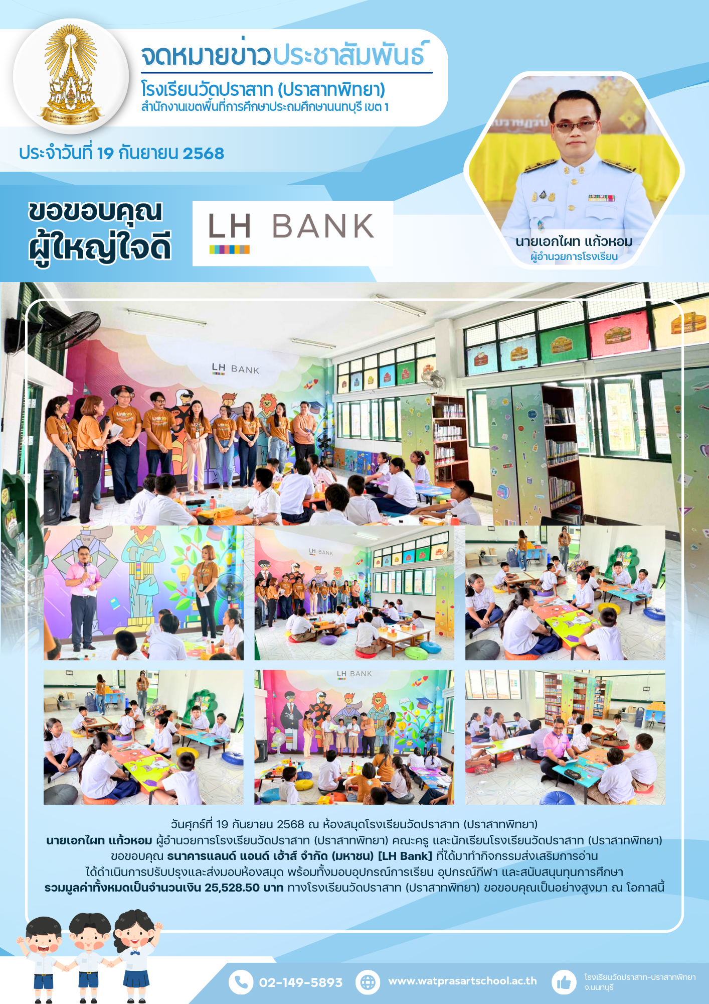 วันศุกร์ที่ 19 กันยายน 2568 ณ ห้องสมุดโรงเรียนวัดปราสาท (ปราสาทพิทยา) นายเอกไผท แก้วหอม ผู้อำนวยการโรงเรียนวัดปราสาท (ปราสาทพิทยา) คณะครู และนักเรียนโรงเรียนวัดปราสาท (ปราสาทพิทยา) ขอขอบคุณ ธนาคารแลนด์ แอนด์ เฮ้าส์ จำกัด (มหาชน) [LH Bank] ที่ได้มาทำกิจกรรมส่งเสริมการอ่าน ได้ดำเนินการปรับปรุงและส่งมอบห้องสมุด พร้อมทั้งมอบอุปกรณ์การเรียน อุปกรณ์กีฬา และสนับสนุนทุนการศึกษา รวมมูลค่าทั้งหมดเป็นจำนวนเงิน 25,528.50 บาท ทางโรงเรียนวัดปราสาท (ปราสาทพิทยา) ขอขอบคุณเป็นอย่างสูงมา ณ โอกาสนี้