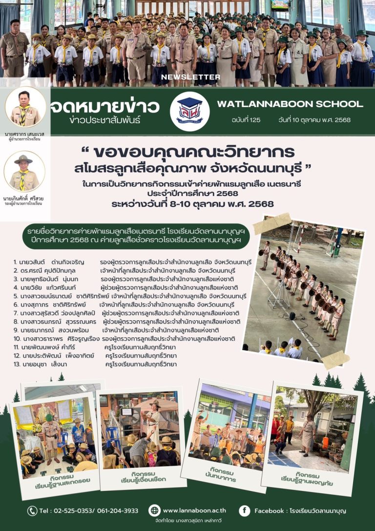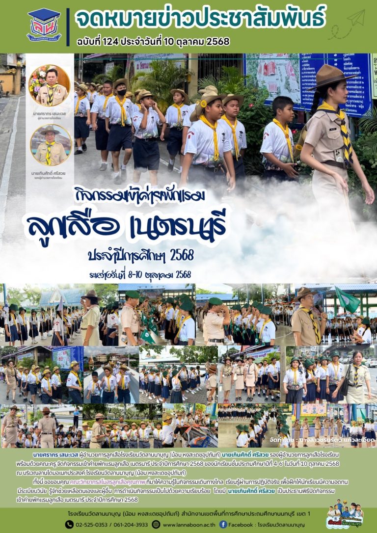 กลุ่มโรงเรียนเมืองนนท์ 1“กิจกรรมเข้าค่ายพักแรมลูกเสือ เนตรนารี ประจำปีการศึกษา 2568”10 ตุลาคม 202513 ตุลาคม 2025วัดลานนาบุญ (น้อม หงสะเดชอุปถัมภ์) โรงเรียนอ่านต่อ