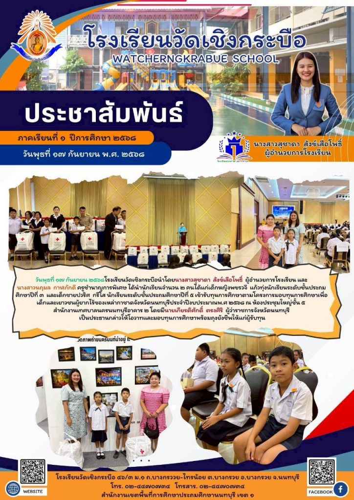 โรงเรียนวัดเชิงกระบือ นำโดย นางสาวสุชาดา สังข์เสือโพธิ์ ผู้อำนวยการโรงเรียนและนางสาวนฤมล กาฬภักดี ครูชำนาญการพิเศษ ได้นำนักเรียนจำนวน 2 คนได้แก่เด็กหญิงพชรวจี แก้วทุ่งนักเรียนระดับชั้นประถมศึกษาปีที่ 3 และเด็กชายปวริศ กริโส นักเรียนระดับชั้นประถมศึกษาปีที่ 5 เข้ารับทุนการศึกษาตามโครงการมอบทุนการศึกษาตามโครงการมอบทุนการศึกษาต่อเพื่อเด็กและเยาวชนผู้ยากไร้ของเหล่ากาชาดจังหวัดนนทบุรี ประจำปีงบประมาณ พ.ศ.2568