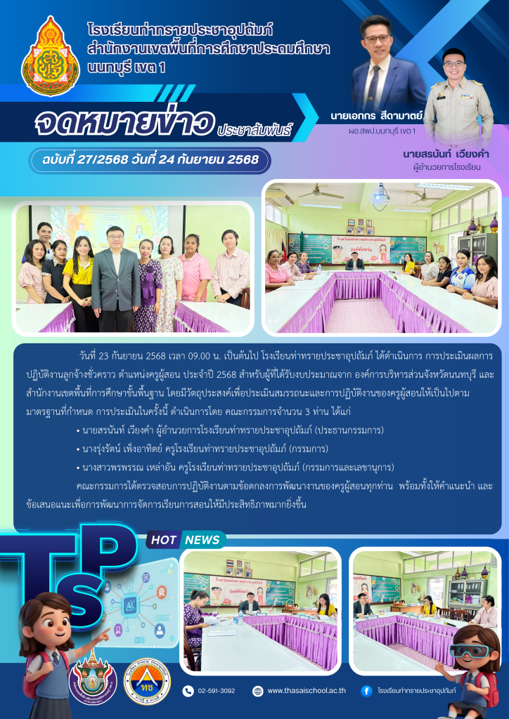 วันที่ 23 กันยายน 2568 เวลา 09.00 น. เป็นต้นไป โรงเรียนท่าทรายประชาอุปถัมภ์ ได้ดำเนินการประเมินผลการปฏิบัติงานลูกจ้างชั่วคราว ตำแหน่งครูผู้สอน ประจำปี 2568 สำหรับผู้ที่ได้รับงบประมาณจาก องค์การบริหารส่วนจังหวัดนนทบุรี และ สำนักงานเขตพื้นที่การศึกษาขั้นพื้นฐาน โดยมีวัตถุประสงค์เพื่อประเมินสมรรถนะและการปฏิบัติงานของครูผู้สอนให้เป็นไปตามมาตรฐานที่กำหนด การประเมินในครั้งนี้ ดำเนินการโดย คณะกรรมการจำนวน 3 ท่าน ได้แก่