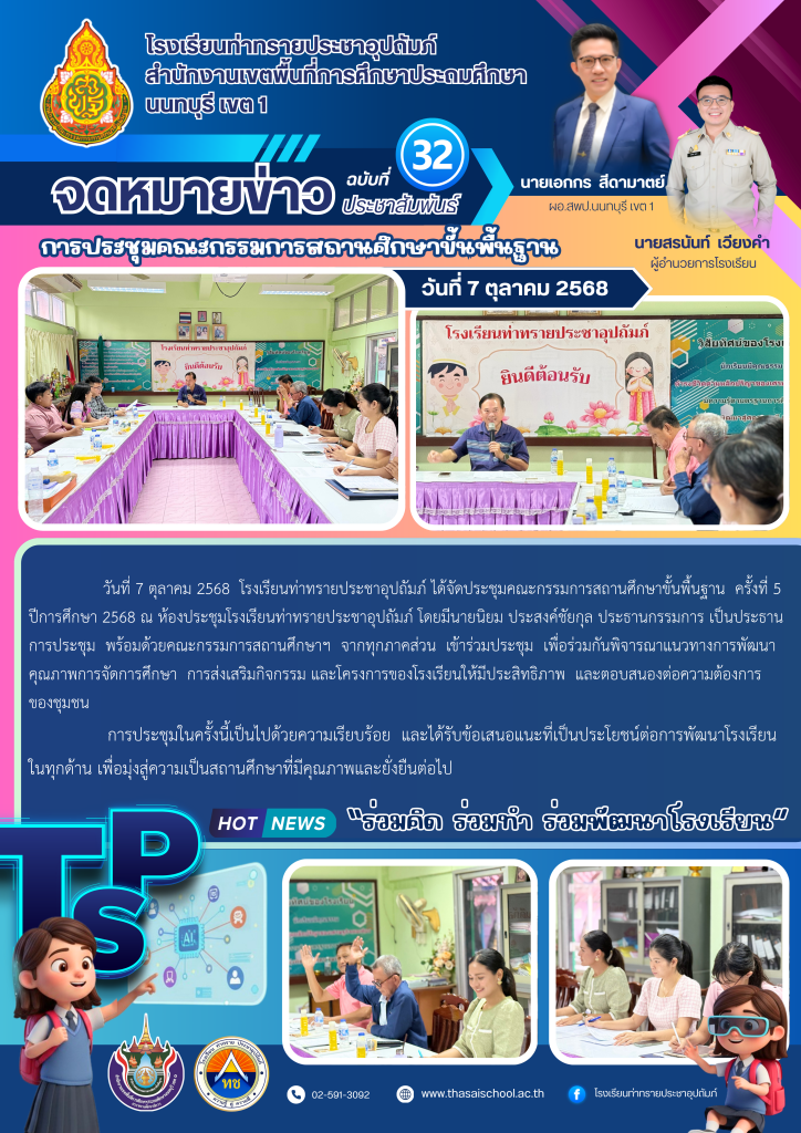 วันที่ 7 ตุลาคม 2568 โรงเรียนท่าทรายประชาอุปถัมภ์ ได้จัดประชุมคณะกรรมการสถานศึกษาขั้นพื้นฐาน ครั้งที่ 5/2568 ณ ห้องประชุมโรงเรียนท่าทรายประชาอุปถัมภ์ โดยมีนายนิยม ประสงค์ชัยกุล ประธานกรรมการ เป็นประธานการประชุมพร้อมด้วยคณะกรรมการสถานศึกษาฯ จากทุกภาคส่วน เข้าร่วมประชุม เพื่อร่วมกันพิจารณาแนวทางการพัฒนาคุณภาพการจัดการศึกษา การส่งเสริมกิจกรรม และโครงการของโรงเรียนให้มีประสิทธิภาพ และตอบสนองต่อความต้องการของชุมชน