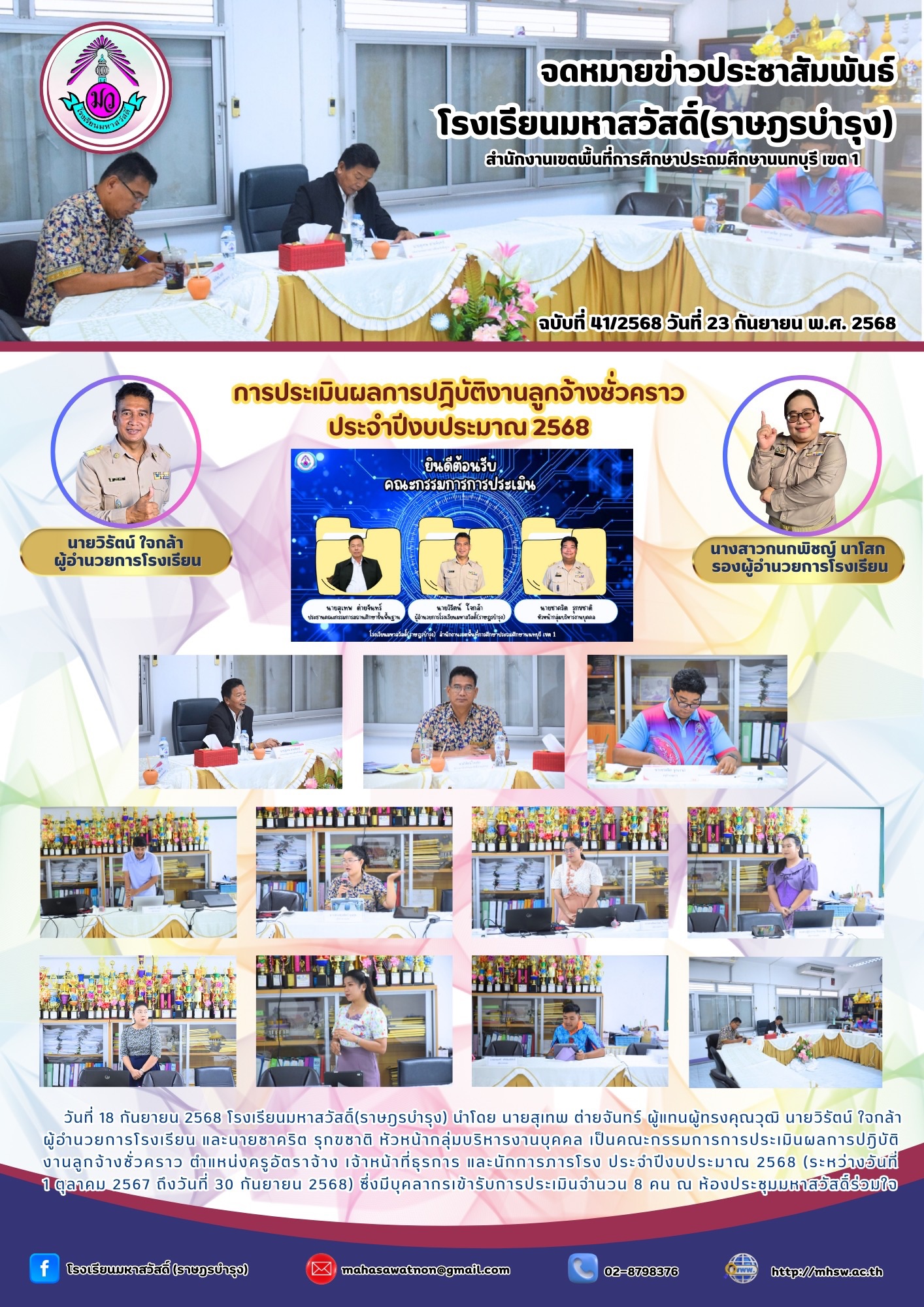 วันที่ 18 กันยายน 2568 โรงเรียนมหาสวัสดิ์(ราษฎรบำรุง) นำโดย นายสุเทพ ต่ายจันทร์ ผู้แทนผู้ทรงคุณวุฒิ นายวิรัตน์ ใจกล้า ผู้อำนวยการโรงเรียน และนายชาคริต รุกขชาติ หัวหน้ากลุ่มบริหารงานบุคคล เป็นคณะกรรมการการประเมินผลการปฎิบัติ งานลูกจ้างชั่วคราว ตำแหน่งครูอัตราจ้าง เจ้าหน้าที่ธุรการ และนักการภารโรง ประจำปีงบประมาณ 2568 (ระหว่างวันที่ 1 ตุลาคม 2567 ถึงวันที่ 30 กันยายน 2568) ซึ่งมีบุคลากรเข้ารับการประเมินจำนวน 8 คน ณ ห้องประชุมมหาสวัสดิ์ร่วมใจ
