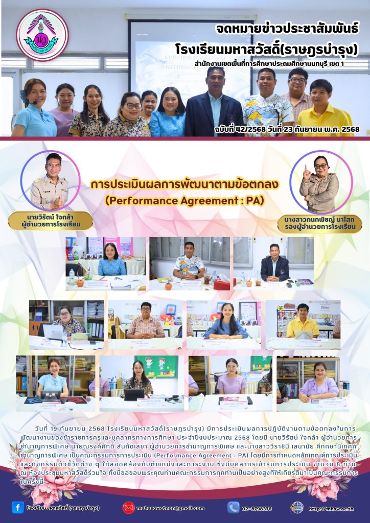 วันที่ 19 กันยายน 2568 โรงเรียนมหาสวัสดิ์(ราษฎรบำรุง) มีการประเมินผลการปฏิบัติงานตามข้อตกลงในการพัฒนางานของข้าราชการครูและบุคลากรทางการศึกษา ประจำปีงบประมาณ 2568 โดยมี นายวิรัตน์ ใจกล้า ผู้อำนวยการชำนาญการพิเศษ นายณรงค์ศักดิ์ สันทัดเลขา ผู้อำนวยการชำนาญการพิเศษ และนางสาววีราชินี เสนานัย ศึกกษานิเทศก์ชำนาญการพิเศษ เป็นคณะกรรมการการประเมิน (Performance Agreement : PA) โดยมีการกำหนดหลักเกณฑ์การประเมินและกิจกรรมตัวชี้วัดต่าง ๆ ให้สอดคล้องกับตำแหน่งและภาระงาน ซึ่งมีบุคลากรเข้ารับการประเมิน จำนวน 8 ท่าน ณ ห้องประชุมมหาสวัสดิ์ร่วมใจ ทั้งนี้ขอขอบพระคุณท่านคณะกรรมการทุกท่านเป็นอย่างสูงที่ให้เกียรติมาเป็นคณะกรรมการในครั้งนี้