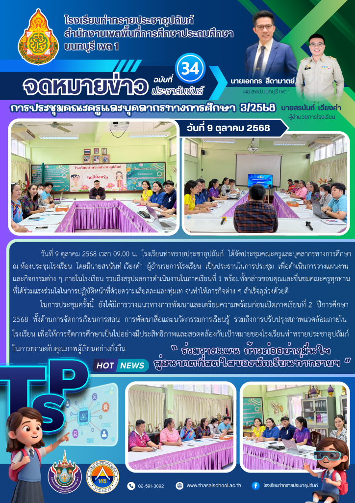 วันที่ 9 ตุลาคม 2568 เวลา 09.00 น. โรงเรียนท่าทรายประชาอุปถัมภ์ ได้จัดประชุมคณะครูและบุคลากรทางการศึกษา ณ ห้องประชุมโรงเรียน โดยมีนายสรนันท์ เวียงคำ ผู้อำนวยการโรงเรียน เป็นประธานในการประชุม เพื่อดำเนินการวางแผนงานและกิจกรรมต่าง ๆ ภายในโรงเรียน รวมถึงสรุปผลการดำเนินงานในภาคเรียนที่ 1 พร้อมทั้งกล่าวขอบคุณและชื่นชมคณะครูทุกท่านที่ได้ร่วมแรงร่วมใจในการปฏิบัติหน้าที่ด้วยความเสียสละและทุ่มเท จนทำให้ภารกิจต่าง ๆ สำเร็จลุล่วงด้วยดี