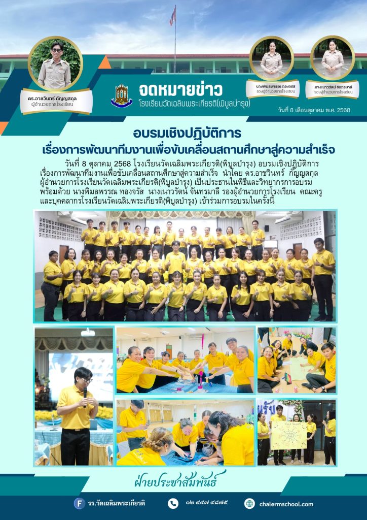 วันที่ 8 ตุลาคม 2568 โรงเรียนวัดเฉลิมพระเกียรติ(พิบูลบำรุง) อบรมเชิงปฏิบัติการ เรื่องการพัฒนาทีมงานเพื่อขับเคลื่อนสถานศึกษาสู่ความสำเร็จ นำโดย ดร.อาชวินทร์ กัญญสกุล ผู้อำนวยการโรงเรียนวัดเฉลิมพระเกียรติ(พิบูลบำรุง) เป็นประธานในพิธีและวิทยากรการอบรม พร้อมด้วย นางพิมลพรรณ ทองจรัส นางเนาวรัตน์ จันทรมาลี รองผู้อำนวยการโรงเรียน คณะครูและบุคคลากรโรงเรียนวัดเฉลิมพระเกียรติ(พิบูลบำรุง) เข้าร่วมการอบรมในครั้งนี้