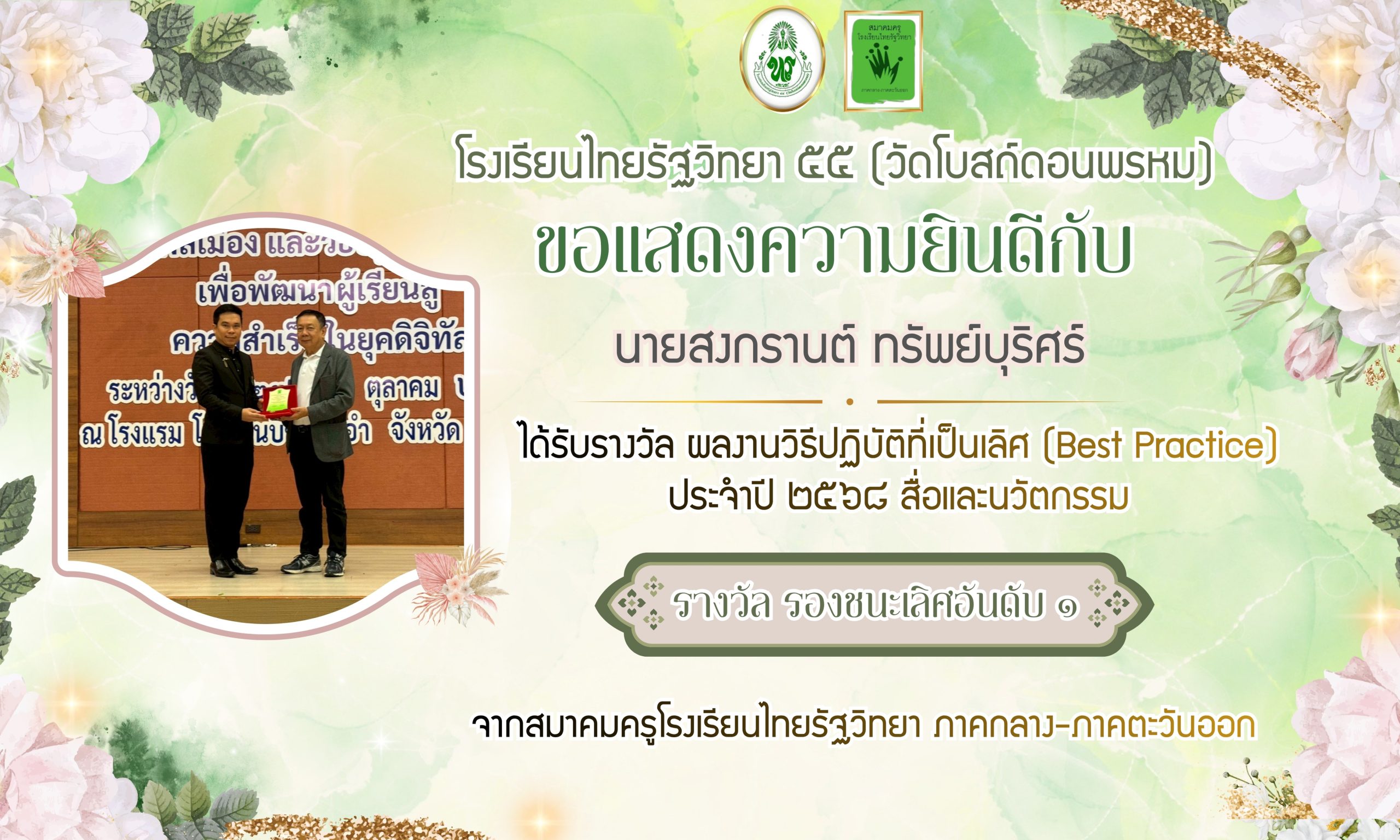 – โรงเรียนไทยรัฐวิทยา ๕๕ (วัดโบสถ์ดอนพรหม) ขอแสดงความยินดีกับ นายสงกรานต์ ทรัพย์บุริศร์ ได้รับรางวัล ผลงานวิธีปฏิบัติที่เป็นเลิศ (Best Practice) ประจำปี ๒๕๖๘ สื่อและนวัตกรรม รางวัล รองชนะเลิศอันดับ ๑ จากสมาคมครูโรงเรียนไทยรัฐวิทยา ภาคกลาง-ภาคตะวันออก