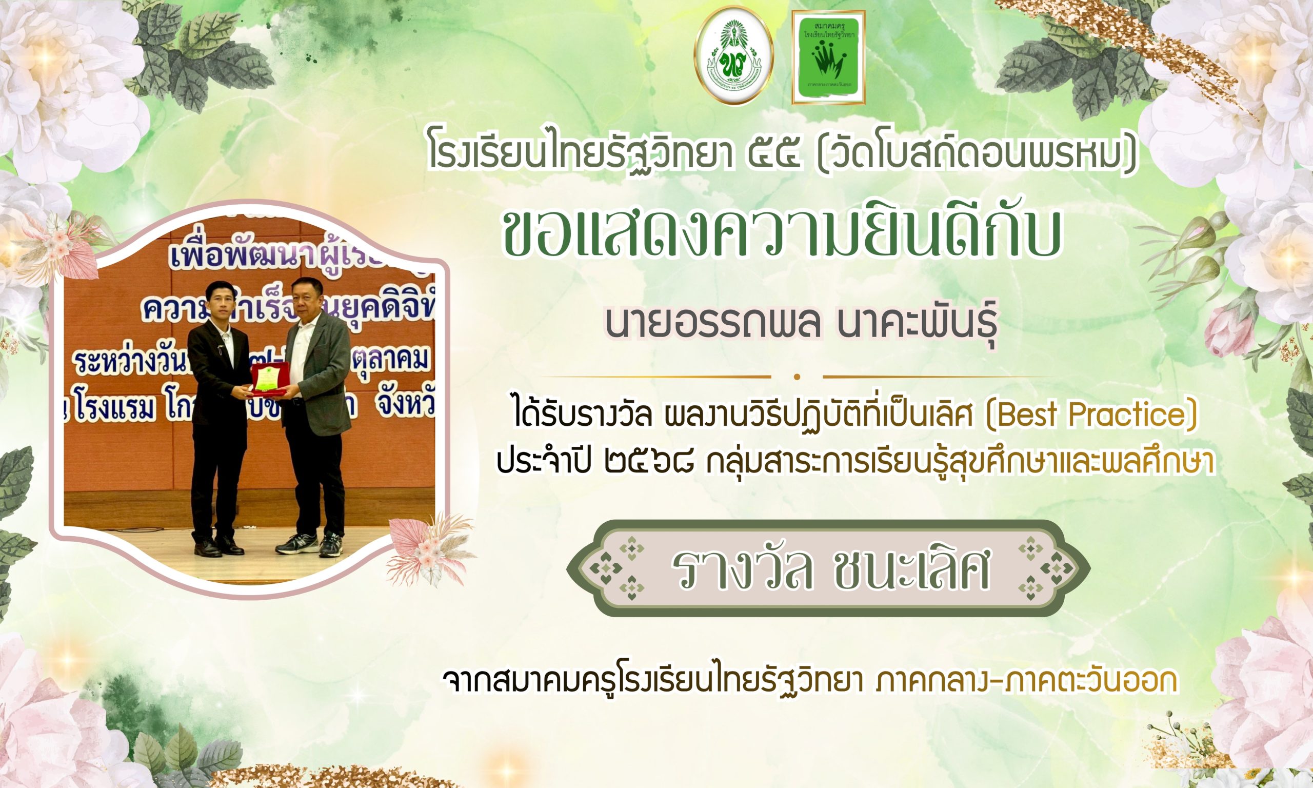 โรงเรียนไทยรัฐวิทยา ๕๕ (วัดโบสถ์ดอนพรหม) ขอแสดงความยินดีกับ นายอรรถพล นาคะพันธุ์ ได้รับรางวัล ผลงานวิธีปฏิบัติที่เป็นเลิศ (Best Practice)ประจำปี ๒๕๖๘ กลุ่มสาระการเรียนรู้สุขศึกษาและพลศึกษา รางวัล ชนะเลิศ จากสมาคมครูโรงเรียนไทยรัฐวิทยา ภาคกลาง-ภาคตะวันออก