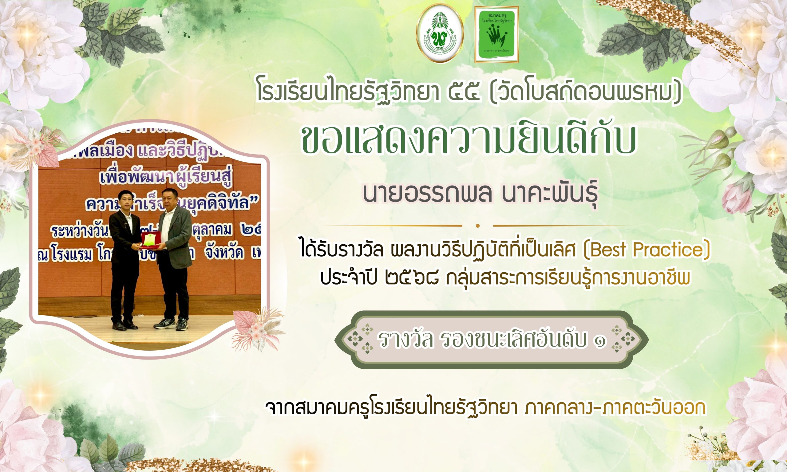 โรงเรียนไทยรัฐวิทยา ๕๕ (วัดโบสถ์ดอนพรหม) ขอแสดงความยินดีกับ นายอรรถพล นาคะพันธุ์ ได้รับรางวัล ผลงานวิธีปฏิบัติที่เป็นเลิศ (Best Practice) ประจำปี ๒๕๖๘ กลุ่มสาระการเรียนรู้การงานอาชีพ รางวัล รองชนะเลิศอันดับ ๑ จากสมาคมครูโรงเรียนไทยรัฐวิทยา ภาคกลาง-ภาคตะวันออก