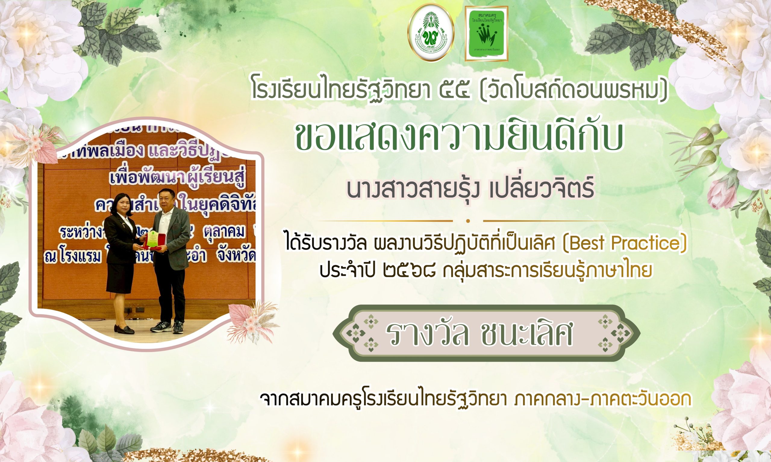 โรงเรียนไทยรัฐวิทยา ๕๕ (วัดโบสถ์ดอนพรหม) ขอแสดงความยินดีกับ นางสาวสายรุ้ง เปลี่ยวจิตร์ ได้รับรางวัล ผลงานวิธีปฏิบัติที่เป็นเลิศ (Best Practice) ประจำปี ๒๕๖๘ กลุ่มสาระการเรียนรู้ภาษาไทย รางวัล ชนะเลิศ จากสมาคมครูโรงเรียนไทยรัฐวิทยา ภาคกลาง-ภาคตะวันออก