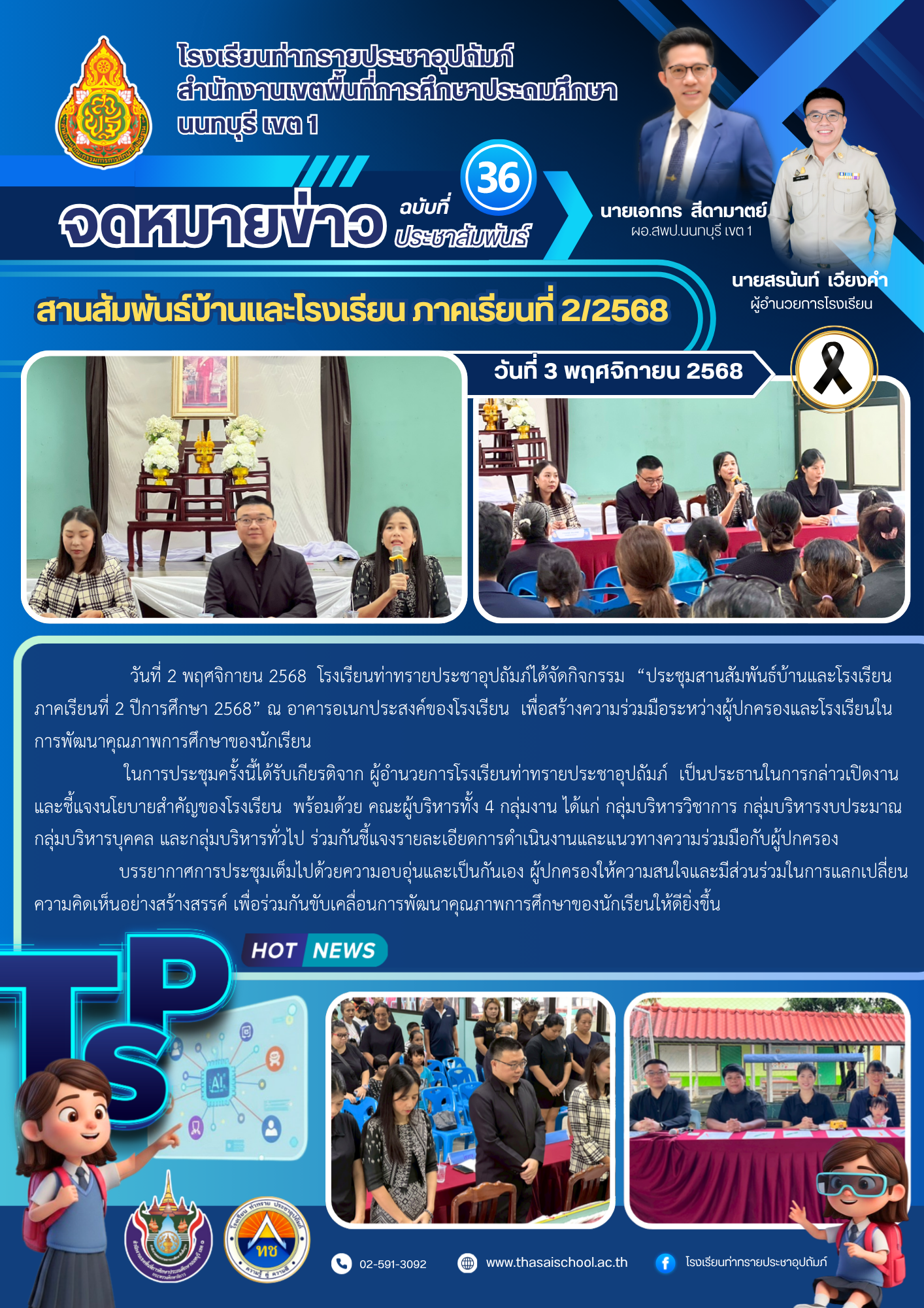 วันที่ 2 พฤศจิกายน 2568 โรงเรียนท่าทรายประชาอุปถัมภ์ได้จัดกิจกรรม “ประชุมสานสัมพันธ์บ้านและโรงเรียน ภาคเรียนที่ 2 ปีการศึกษา 2568” ณ อาคารอเนกประสงค์ของโรงเรียน เพื่อสร้างความร่วมมือระหว่างผู้ปกครองและโรงเรียนในการพัฒนาคุณภาพการศึกษาของนักเรียน