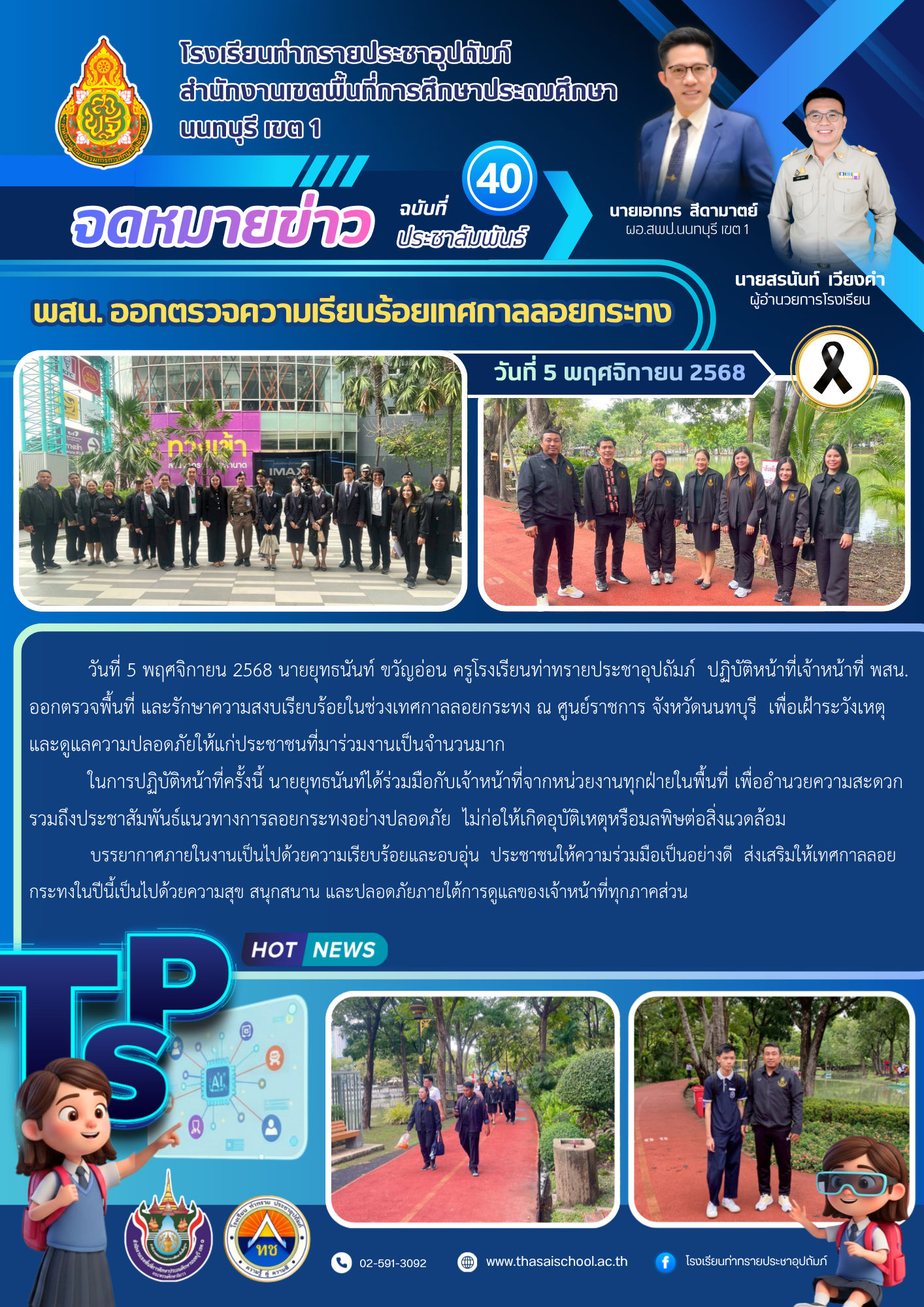 วันที่ 5 พฤศจิกายน 2568 นายยุทธนันท์ ขวัญอ่อน ครูโรงเรียนท่าทรายประชาอุปถัมภ์ ปฏิบัติหน้าที่เจ้าหน้าที่ พสน. ออกตรวจพื้นที่ และรักษาความสงบเรียบร้อยในช่วงเทศกาลลอยกระทง ณ ศูนย์ราชการ จังหวัดนนทบุรี เพื่อเฝ้าระวังเหตุและดูแลความปลอดภัยให้แก่ประชาชนที่มาร่วมงานเป็นจำนวนมาก